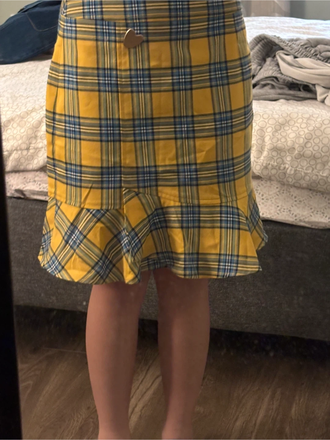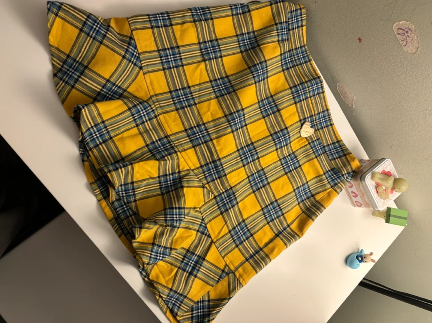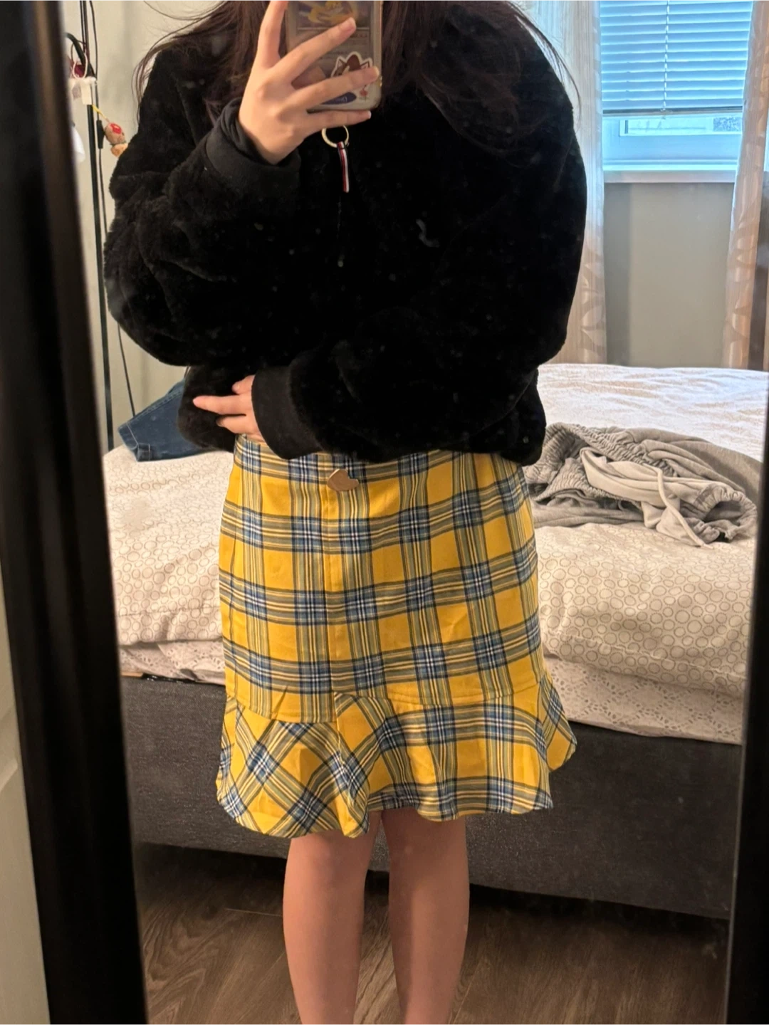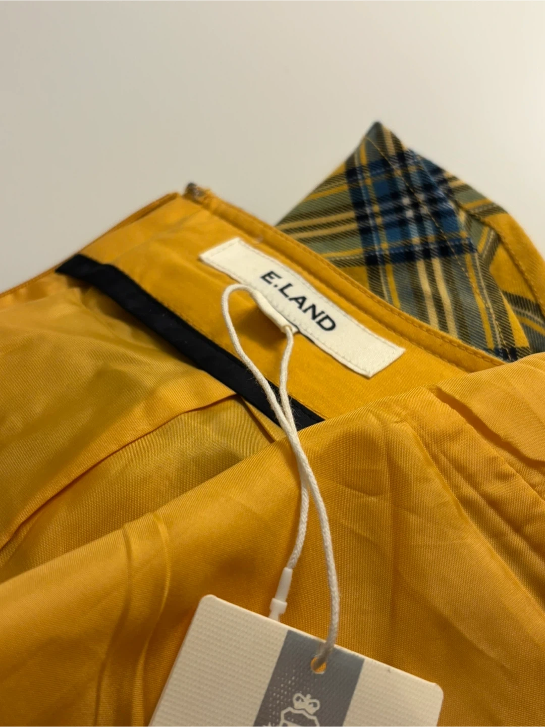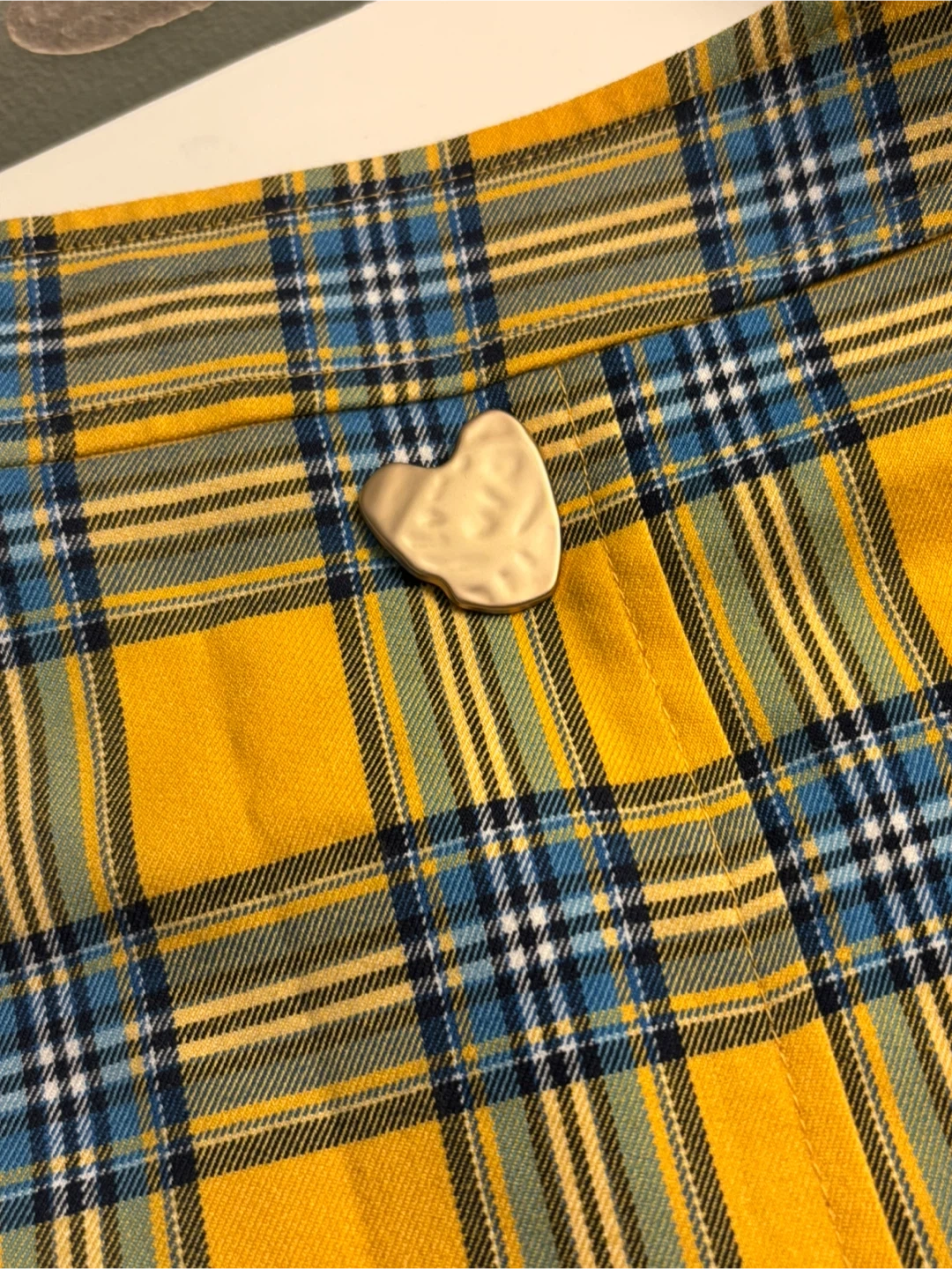 26Here's a cute yellow plaid skirt from E.Land! It features a unique heart-shaped button and a ruffled hem. Perfect for adding a pop of colour to your wardrobe!