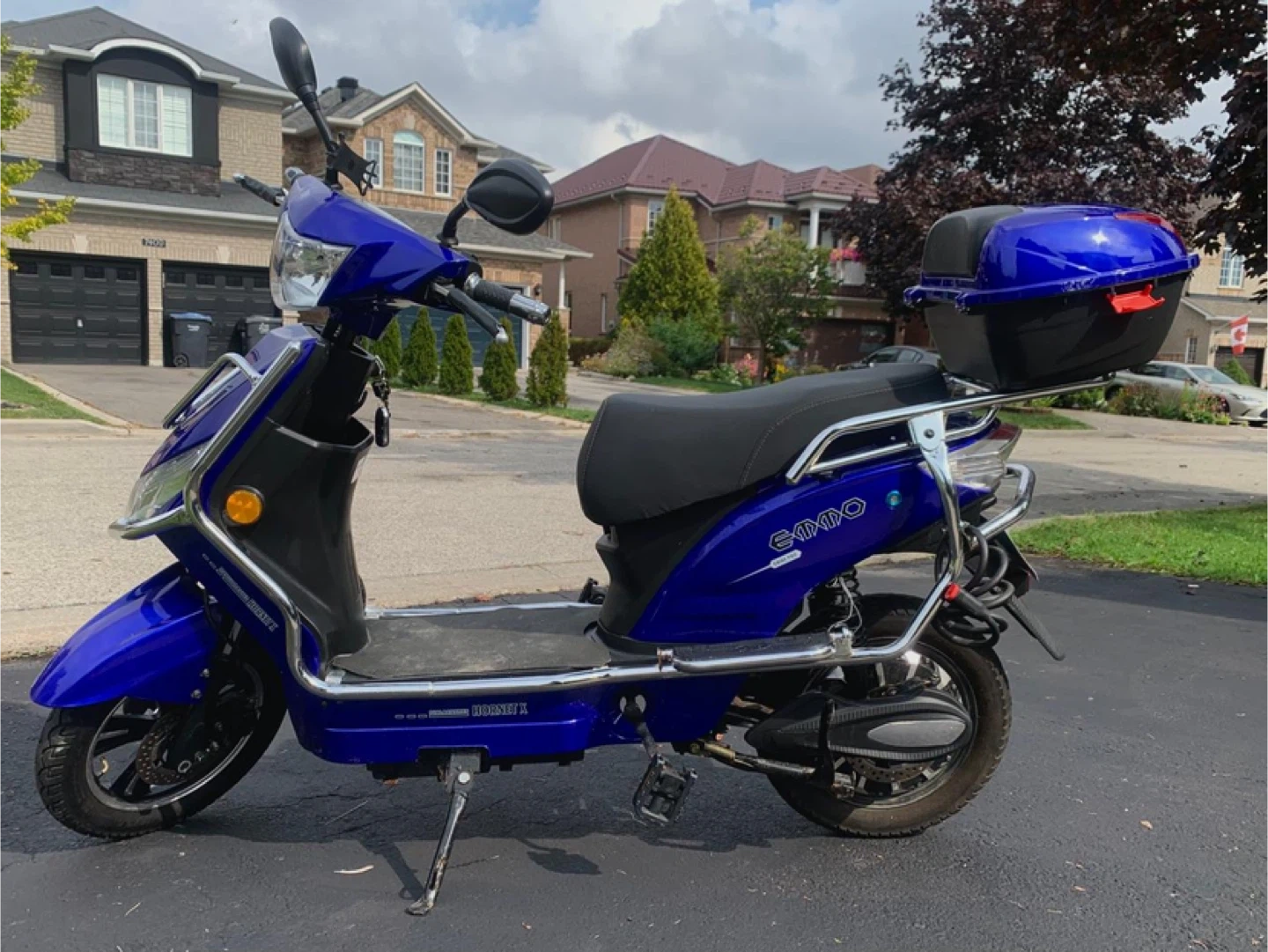 Selling a blue Emmo electric scooter. Great for getting around town! It's in good condition and ready for a new owner. Perfect for eco-friendly commuting and zipping around the neighbourhood