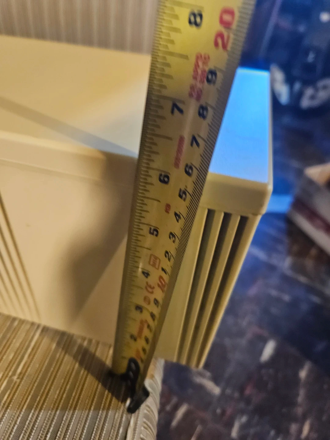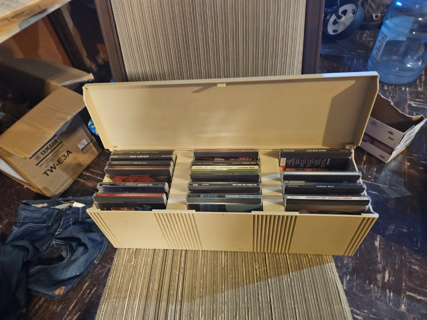 Holds approximately 50 CDs in their jewel cases. Beige plastic construction with a hinged lid. Case measures roughly 17 inches long and 6 inches deep. It's great for keeping your CD collection tidy!