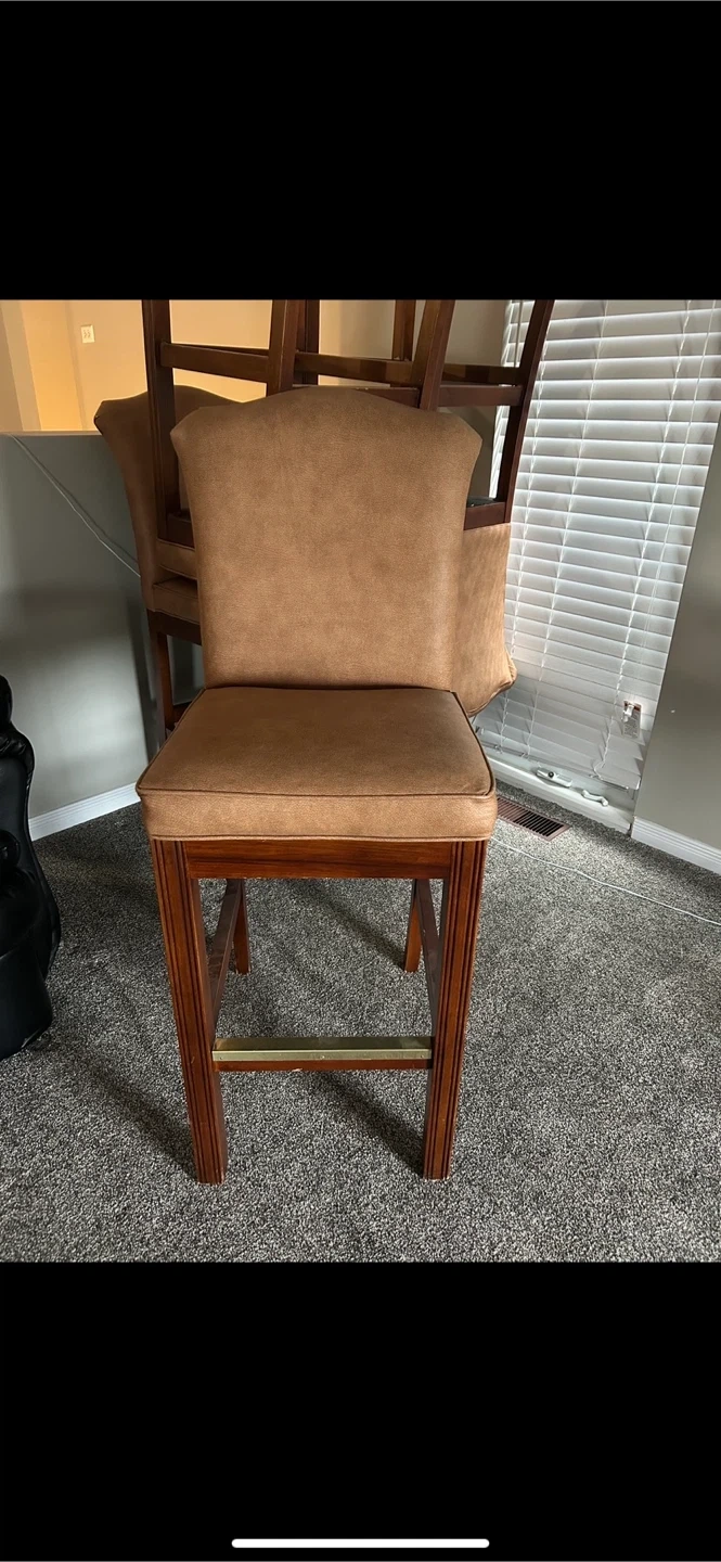 9 bar stool chairs by Fairfield with comfortable faux leather upholstery. Features a warm brown finish and sturdy wood frame. It's got a handy brass footrest. A bit scuffed but good condition otherwise. $25 each or $200 for all 9.