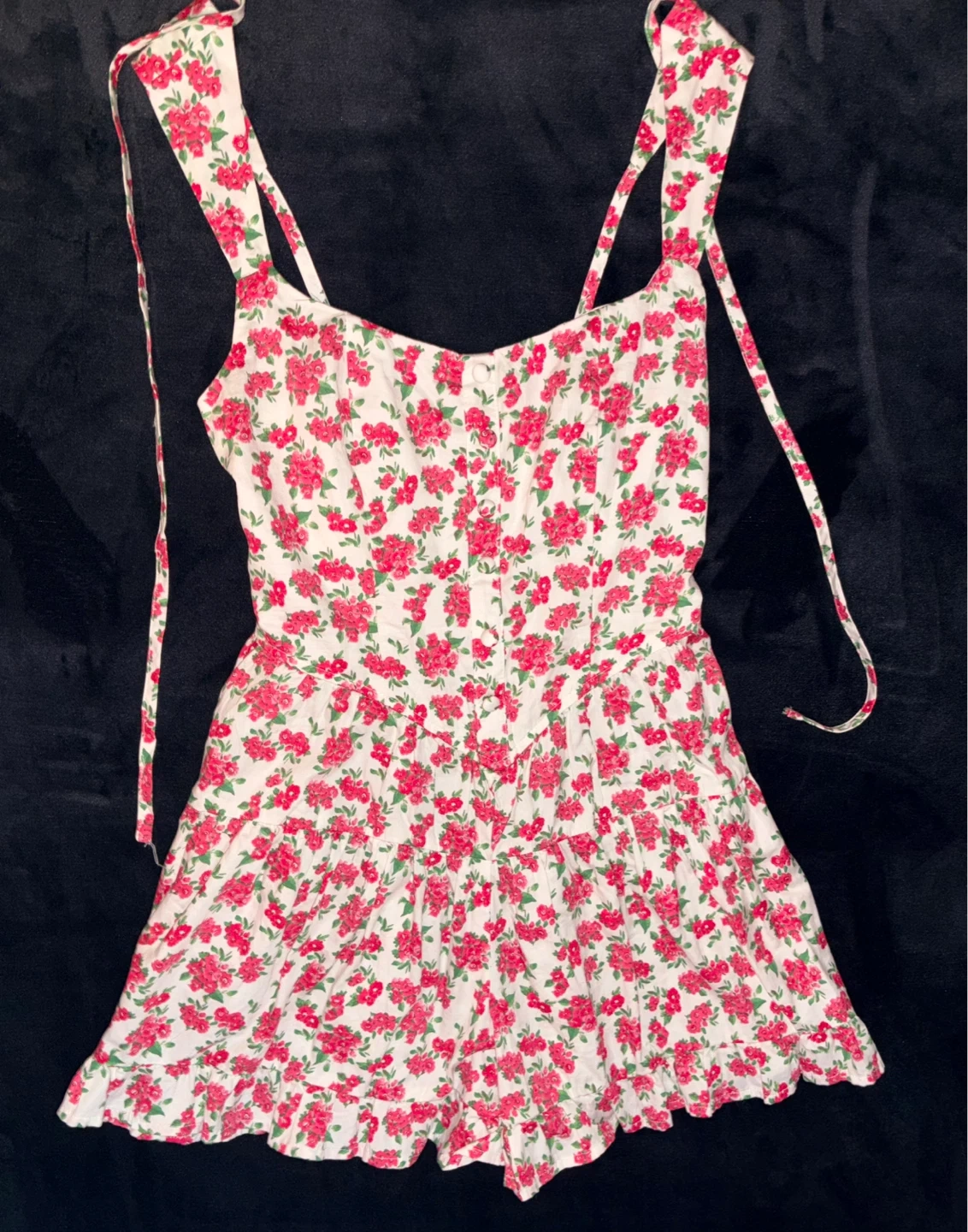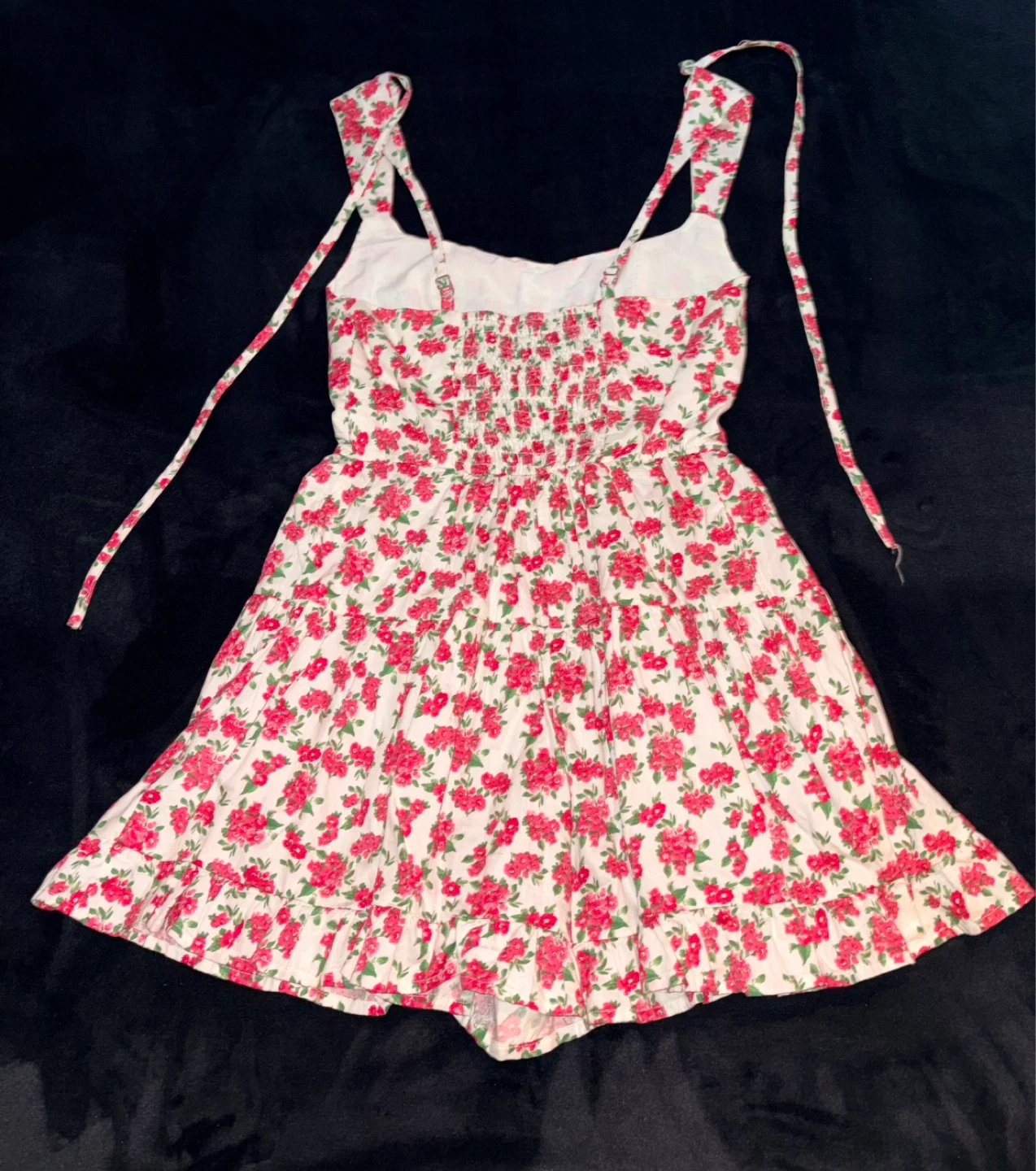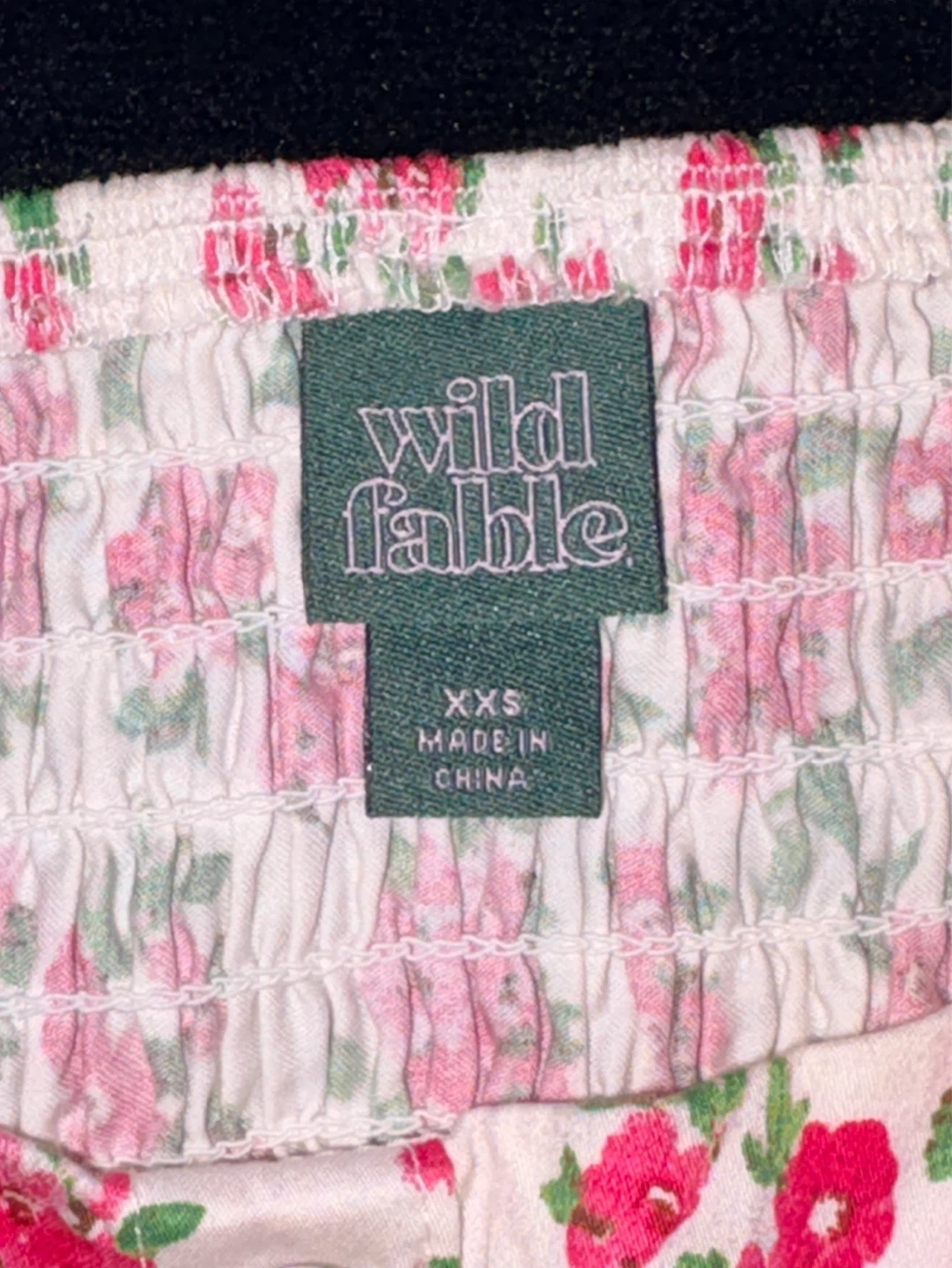 This is a Wild Fable dress in size XXS. It features a white background with a pink floral print. The dress has a smocked back and tie straps.