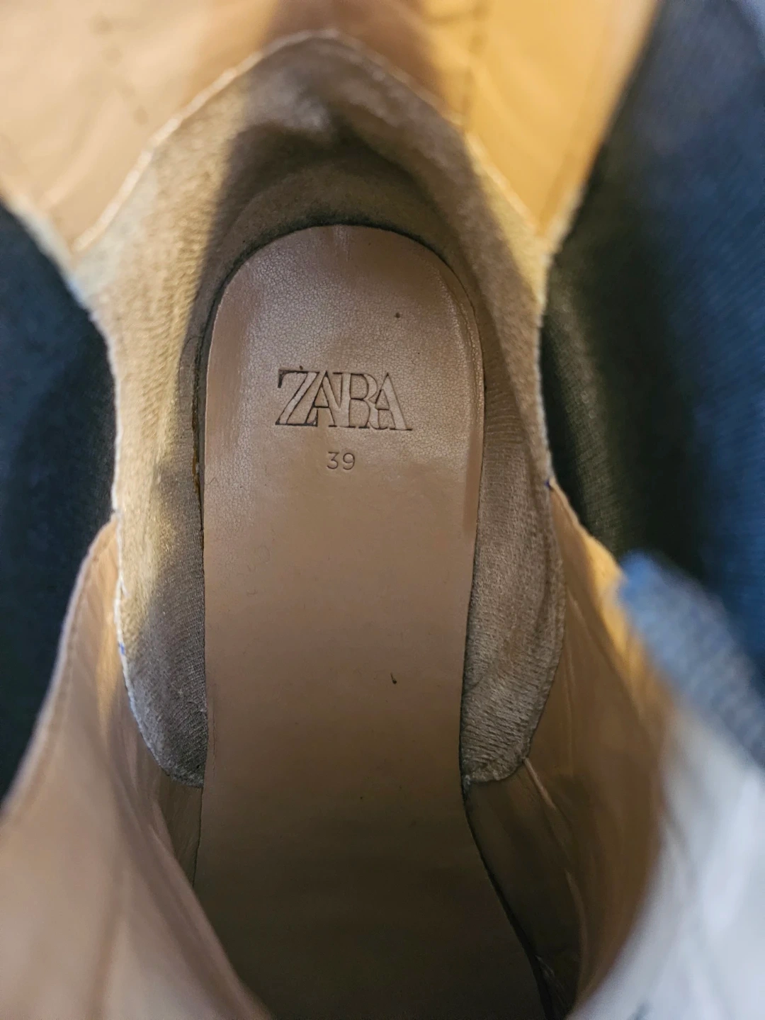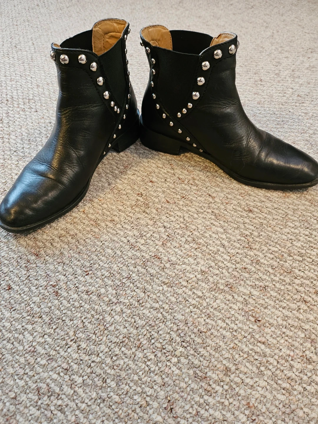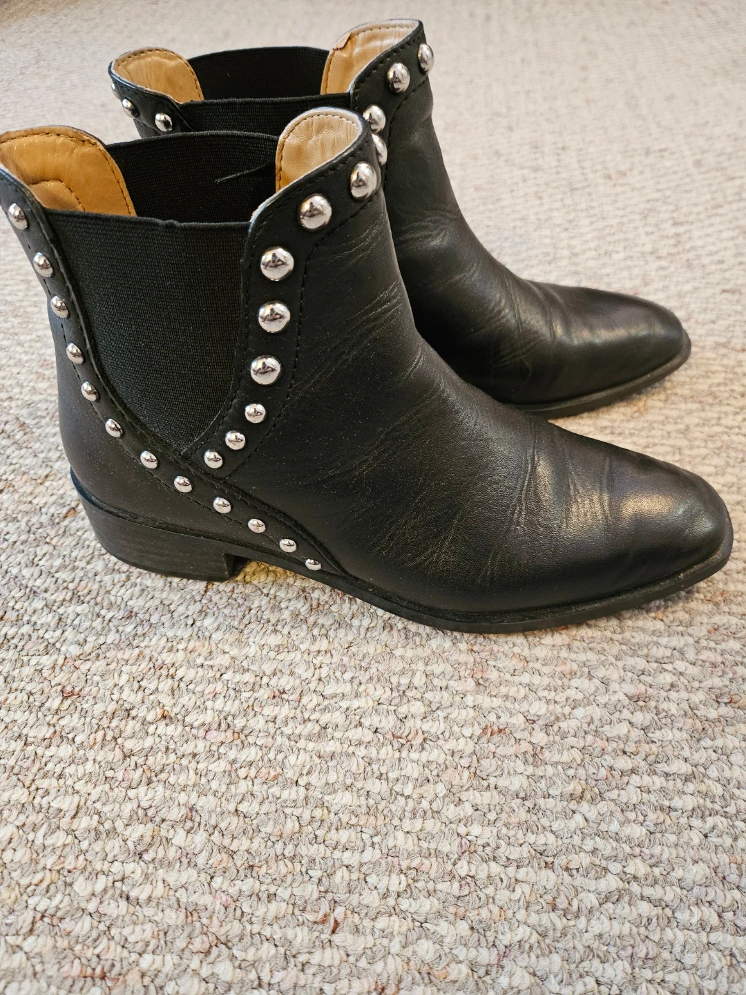 Stylish ZARA ankle boots in black leather. These boots feature decorative silver studs and elastic side panels for easy wear. Size 39.