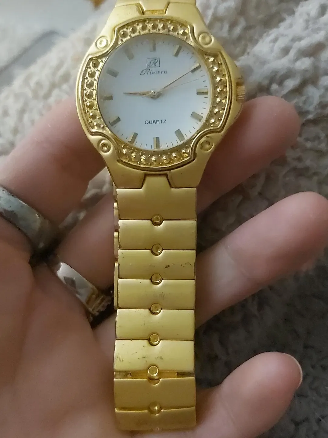 This Riviera watch features a gold-tone band and a white quartz dial. It's a stylish accessory with a decorative, jewelled bezel. This watch would be a nice addition to any outfit!