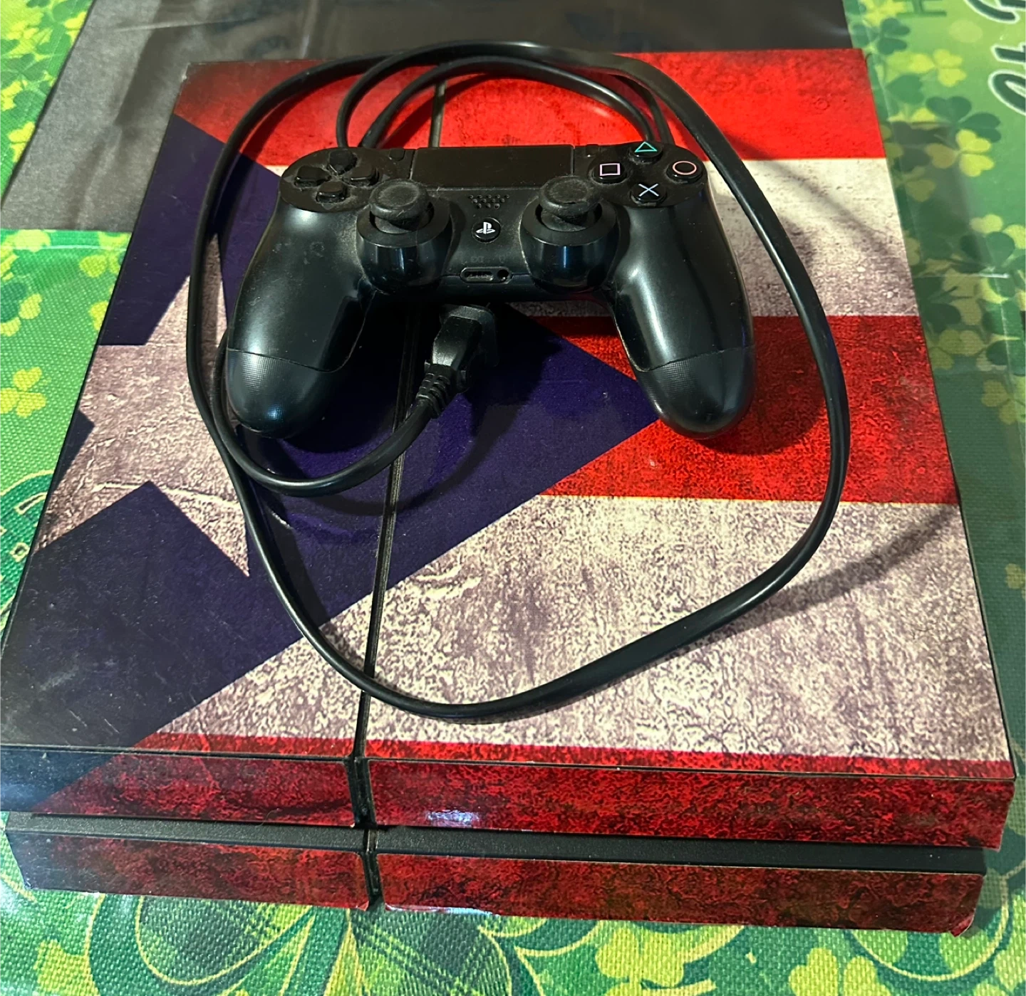 This is a Sony PlayStation 4 Pro console with a custom Puerto Rican flag skin. It includes one black DualShock 4 controller. The console powers on and the controller connects to it.