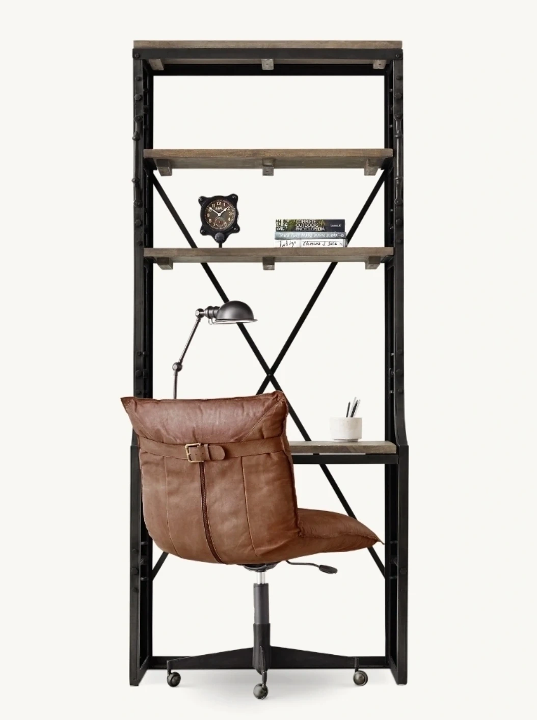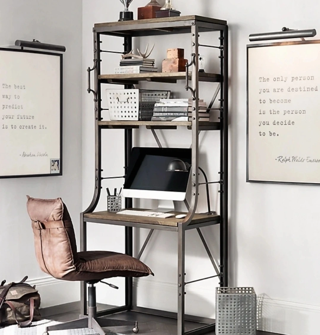 This industrial-style unit features a desk with a bookshelf above. It's constructed with a metal frame and wooden shelves. The design includes multiple shelves for storage and a workspace area.