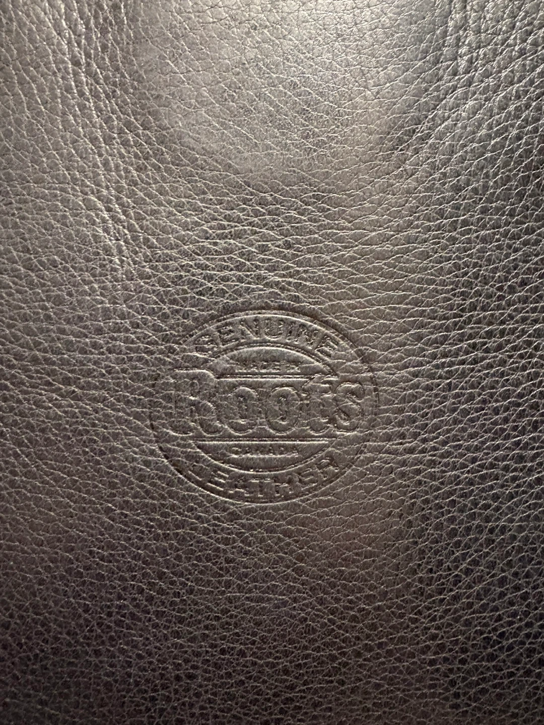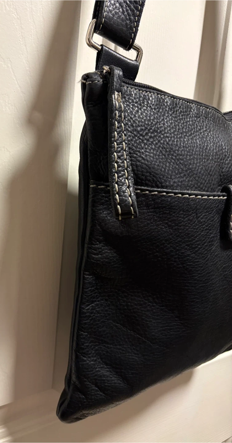 This is a Roots black leather crossbody bag. It's made from genuine leather with white stitching detail. It has a front pocket with a snap closure and a zippered main compartment. It’s in perfect “like new” condition! Pick up in Chestermere.