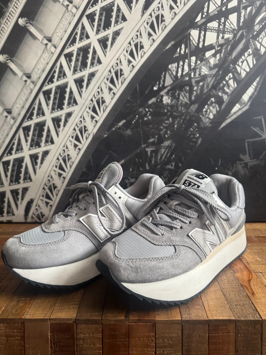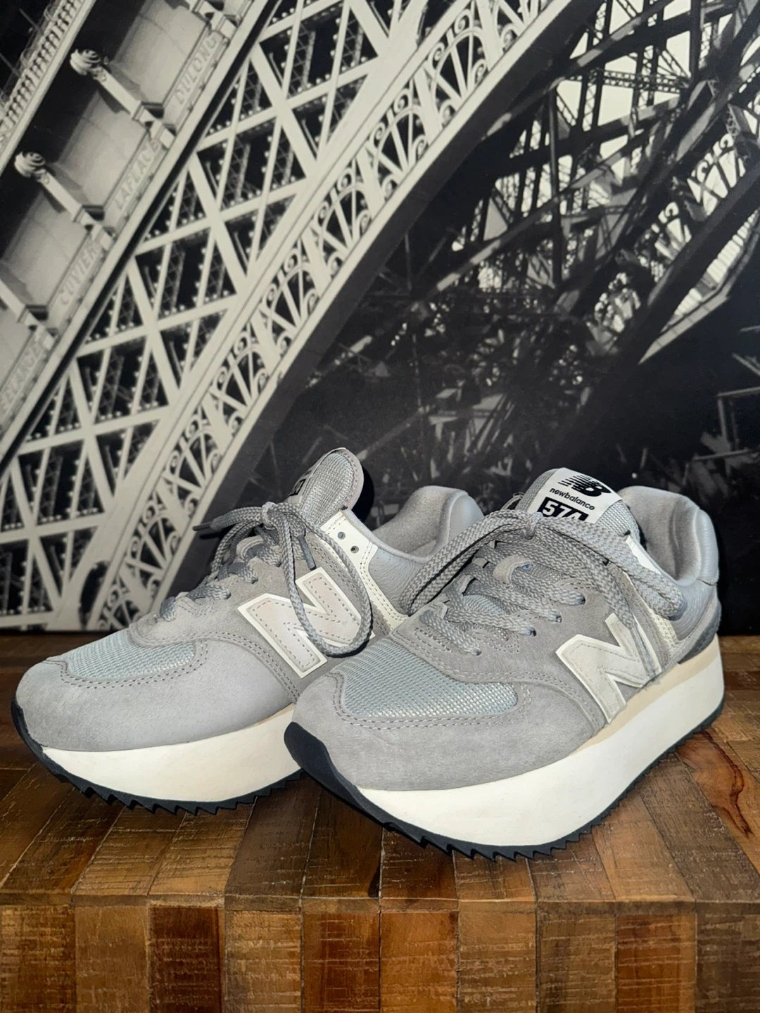 Grey New Balance 574 platform sneakers. Features a suede and mesh upper. These kicks offer a bit of extra height!