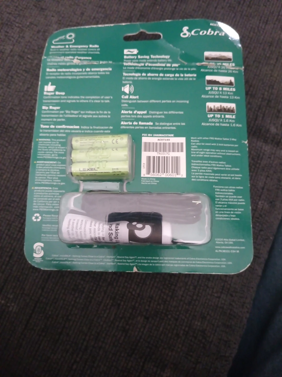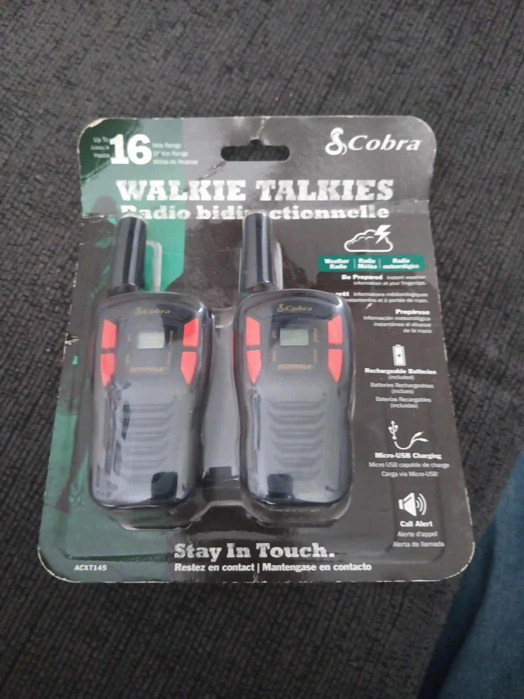These Cobra walkie talkies offer up to 16 channels and a range of up to 9 miles. They feature rechargeable batteries and micro-USB charging. Includes 4 AAA batteries and a charging cable.