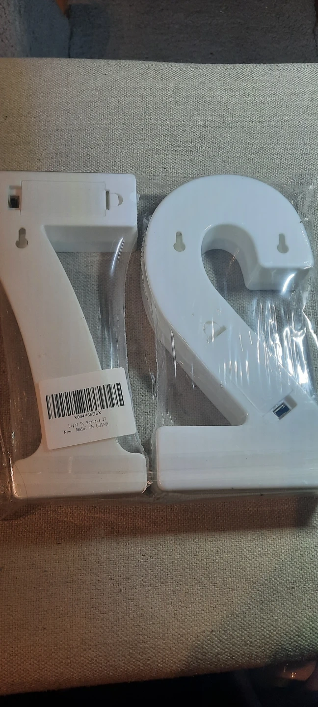 These are white LED marquee numbers, specifically the digits '7'' and '2'. They're made of plastic and have little light bulbs. They can be hung on a wall or displayed on a surface. Perfect for birthdays or anniversaries!