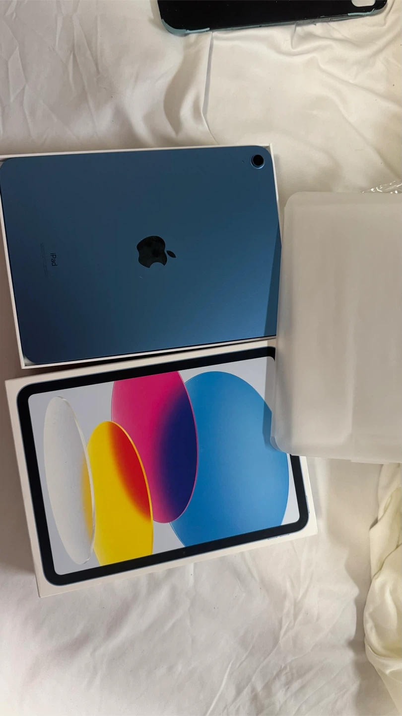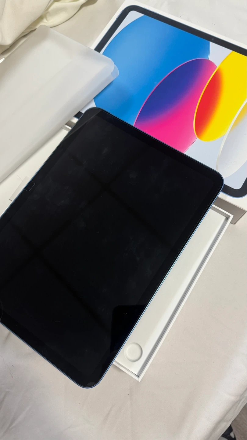 This is a blue Apple iPad 10th generation. It comes with its original box and protective sleeve. The device is in excellent condition.