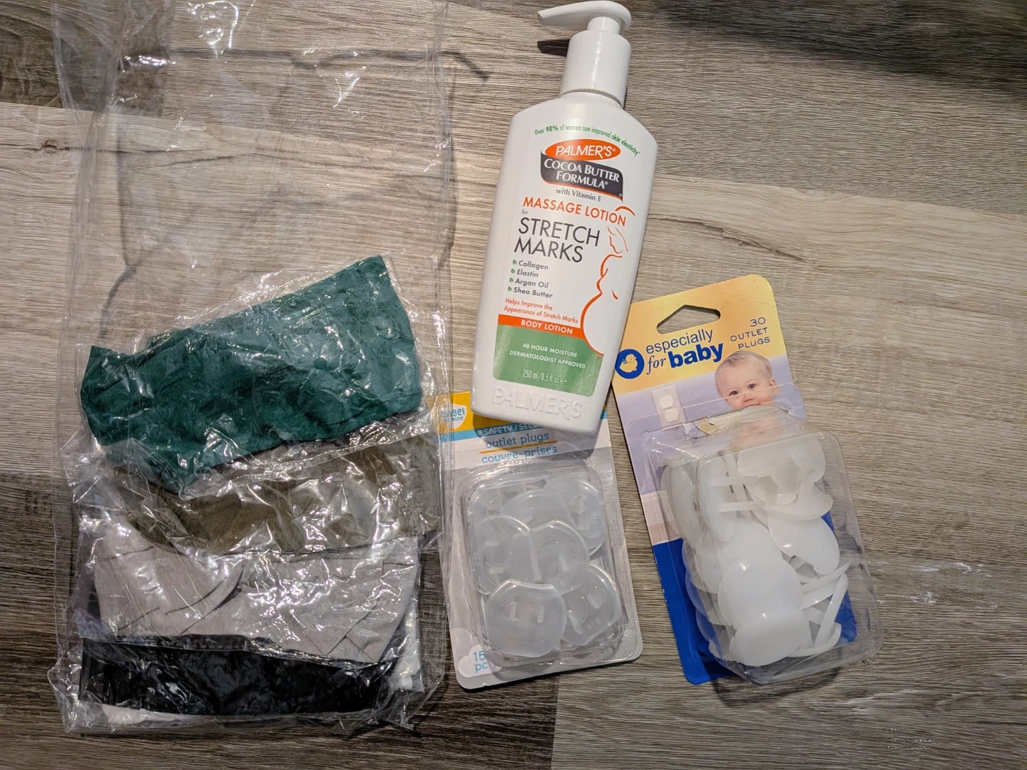 Palmer's Cocoa Butter Formula Massage Lotion for Stretch Marks, 8.5 fl oz. Includes one pack of 30 'Especially for Baby' outlet plugs and one pack of 15 outlet plugs. Also includes baby girl headbands.