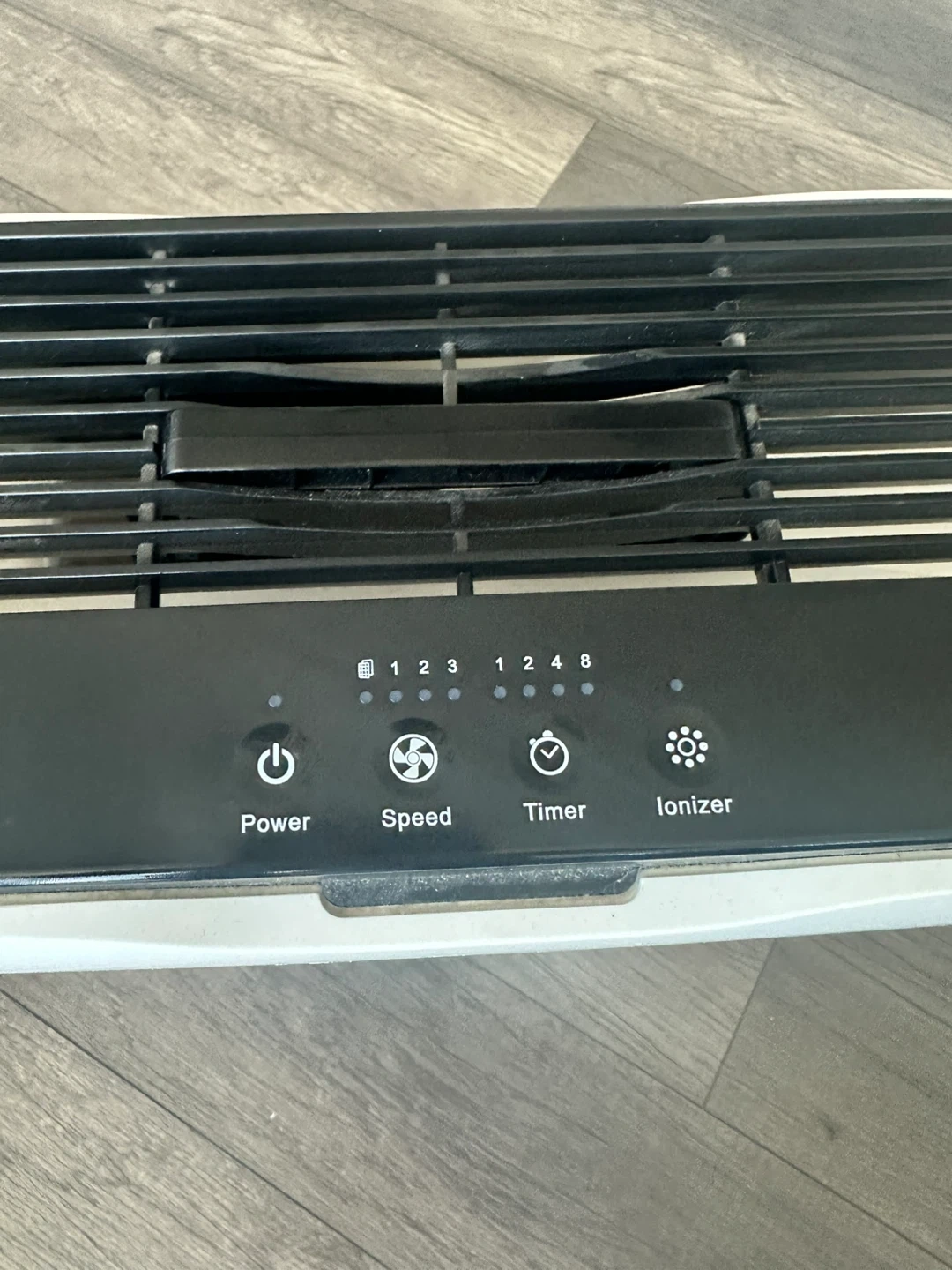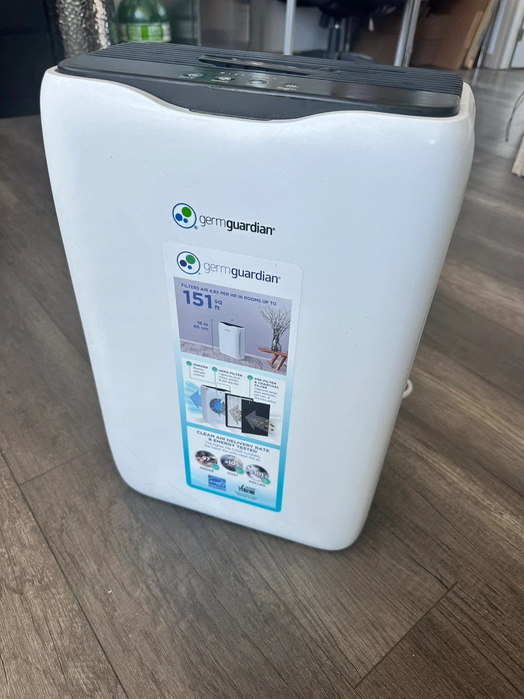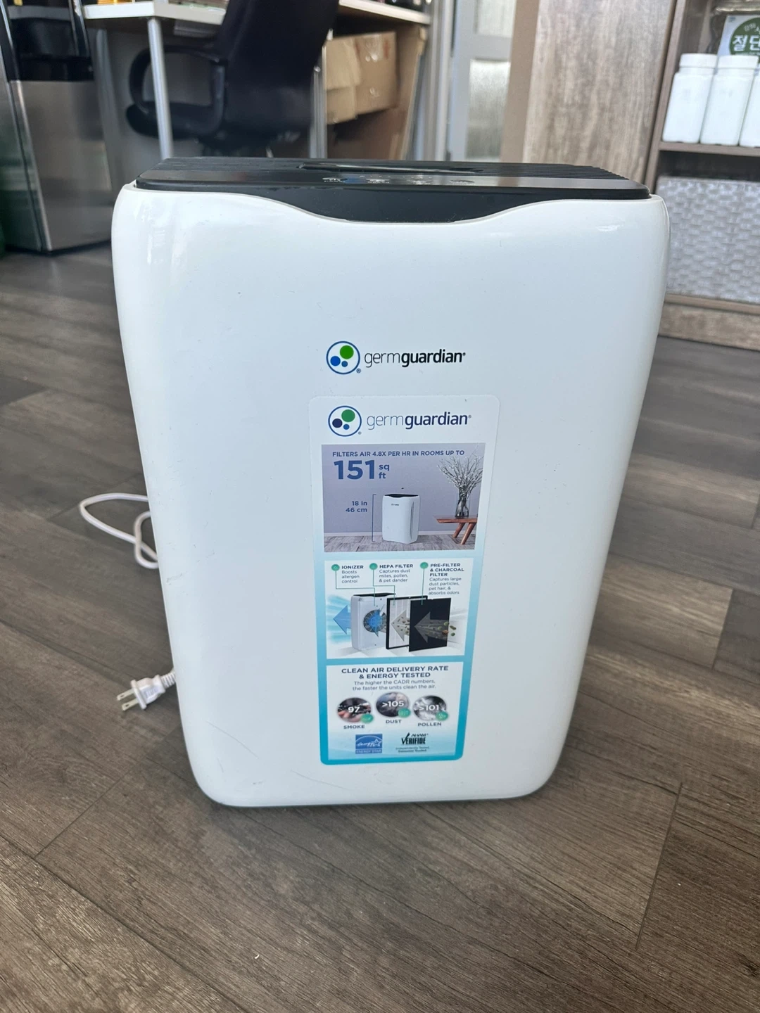 This is a GermGuardian air purifier. It filters air 4.4X per hour in rooms up to 151 sq ft. Features include power, speed, timer, and ionizer settings.