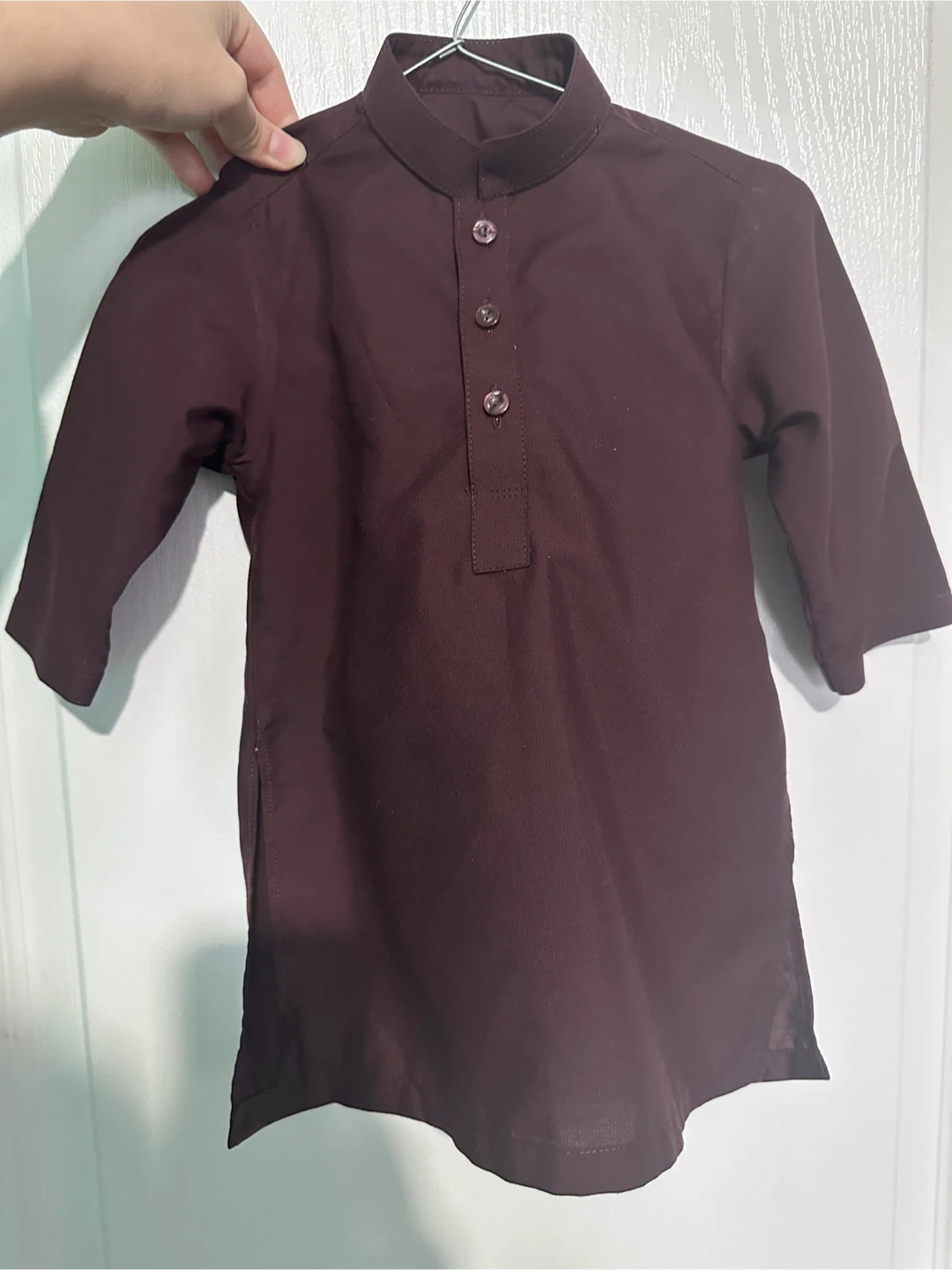 Boy's kurta pajama set in a deep red-brown colour/ Burgandy. Classic Nehru collar with button detailing. Comfortable elastic waistband on the pants. Suitable for festive occasions or everyday wear. Very comfortable material.