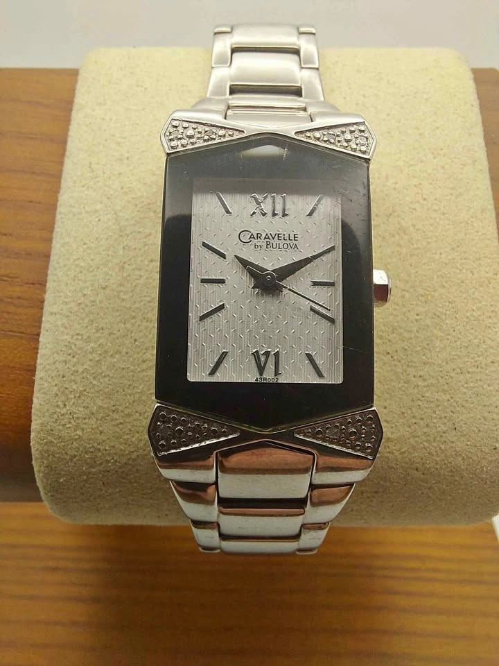 This watch is a Caravelle by Bulova Ladies' Diamond Accent Watch, model number 43R002. It is a dress/formal wristwatch known for its stainless steel construction and crystal embellishments on the case and bracelet.