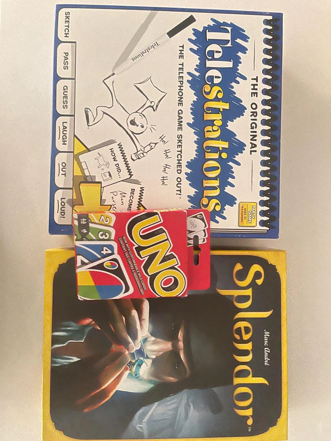Telestrations, Splendor, and UNO Card Games