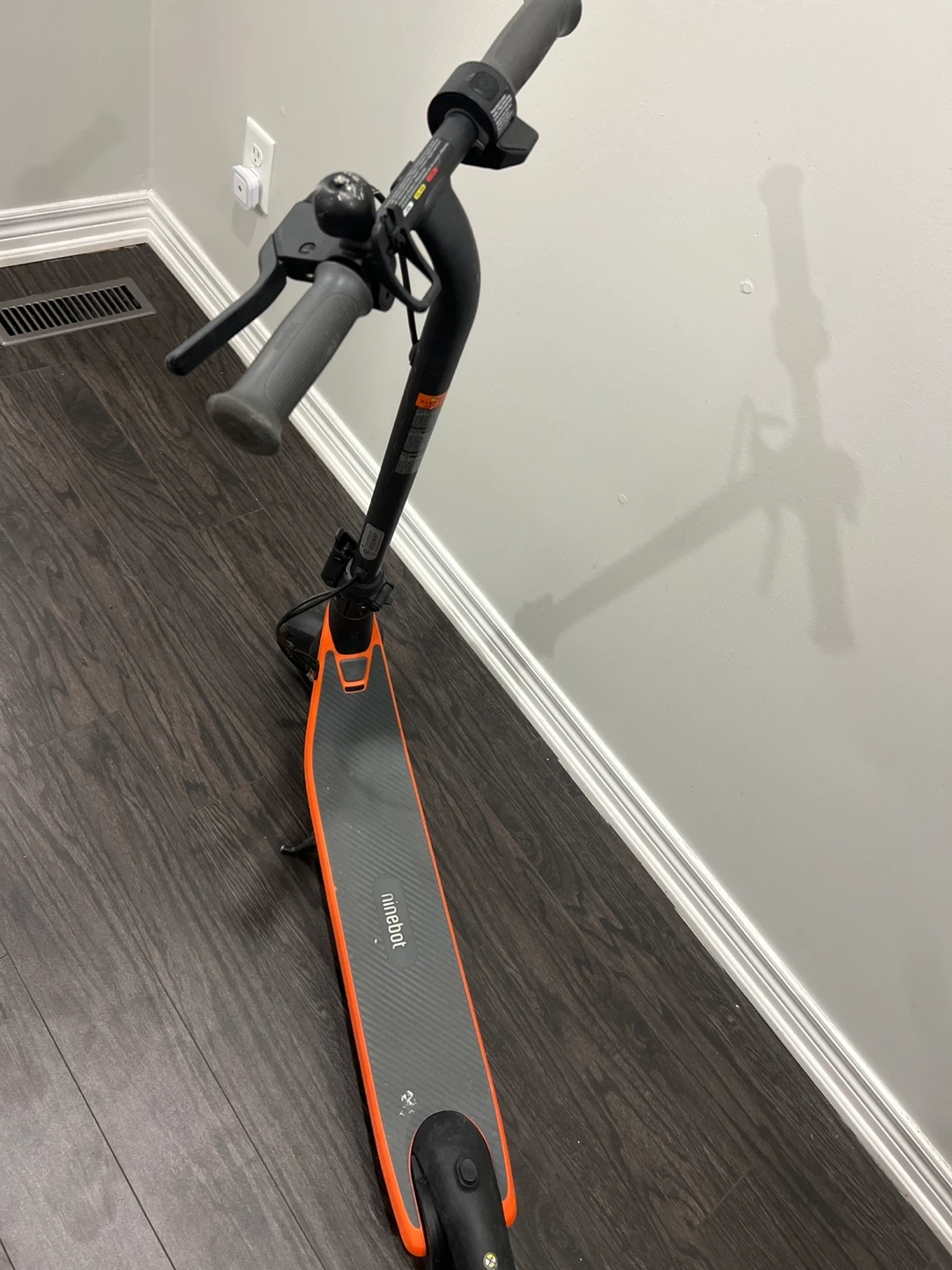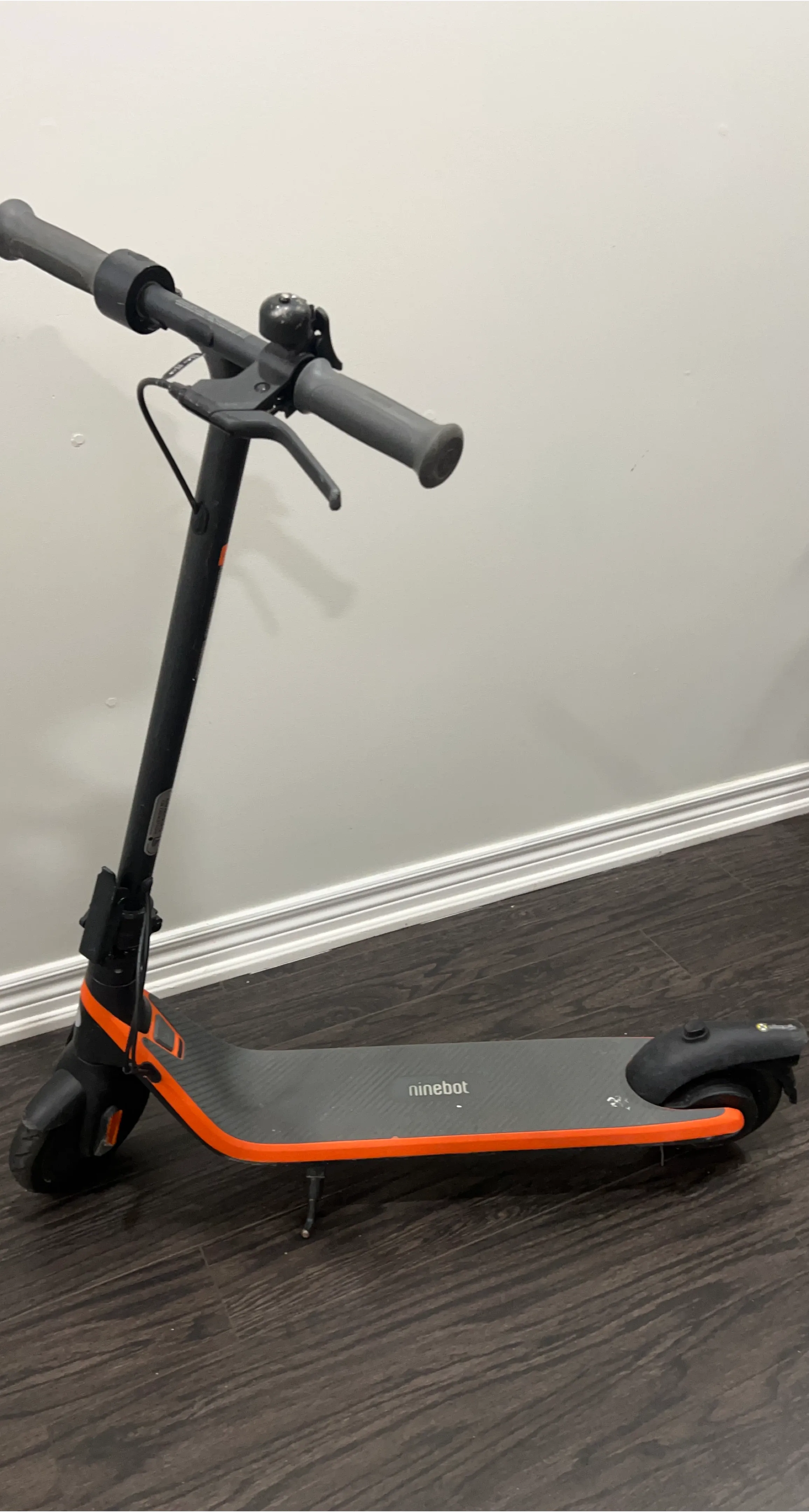 This is a Ninebot electric scooter with orange accents. It's a practical way to get around town! It features a sturdy build for everyday use.