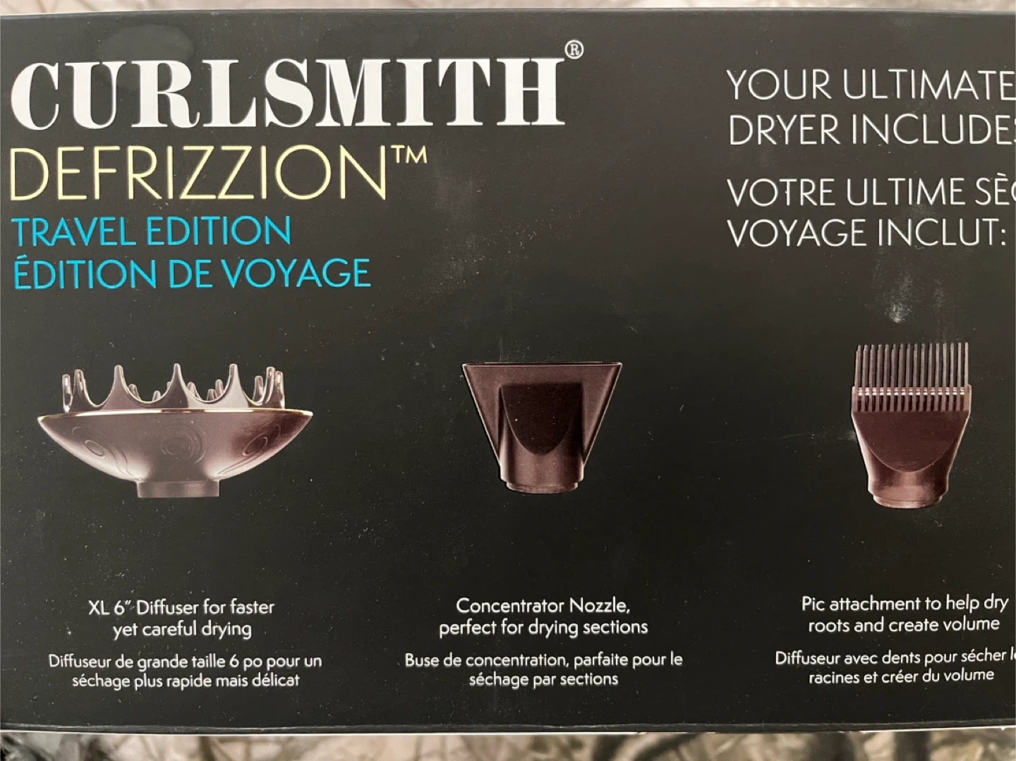 This is the Curlsmith Defrizzion Travel Edition compact dryer. It includes an XL 6" diffuser for faster drying and a concentrator nozzle for drying sections. It also comes with a pic attachment to help dry roots and create volume.