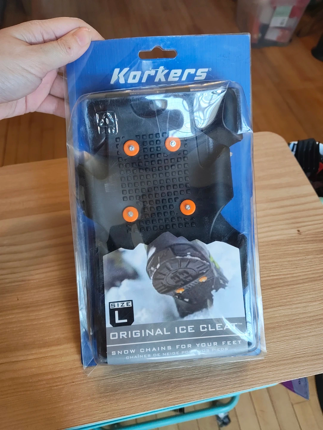 These Korkers Original Ice Cleats are designed for snow chains for your feet. They feature a black rubber base with orange studs for traction on ice. Size is large.