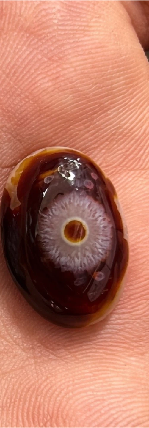 This is a unique agate stone with a natural eye-like pattern. It's a polished cabochon with beautiful brown and white banding. It's smooth to the touch and would make a lovely addition to a collection.