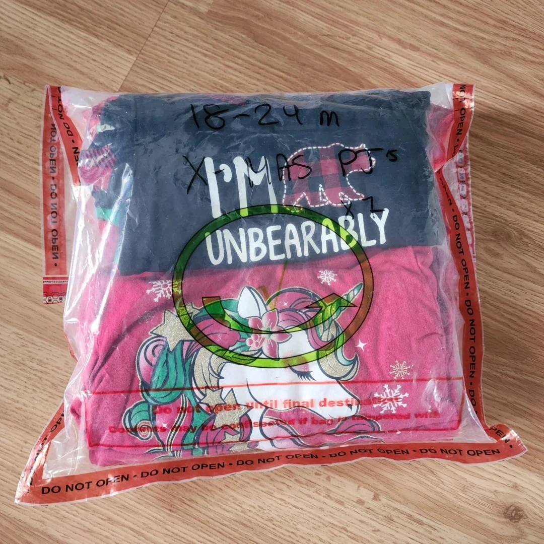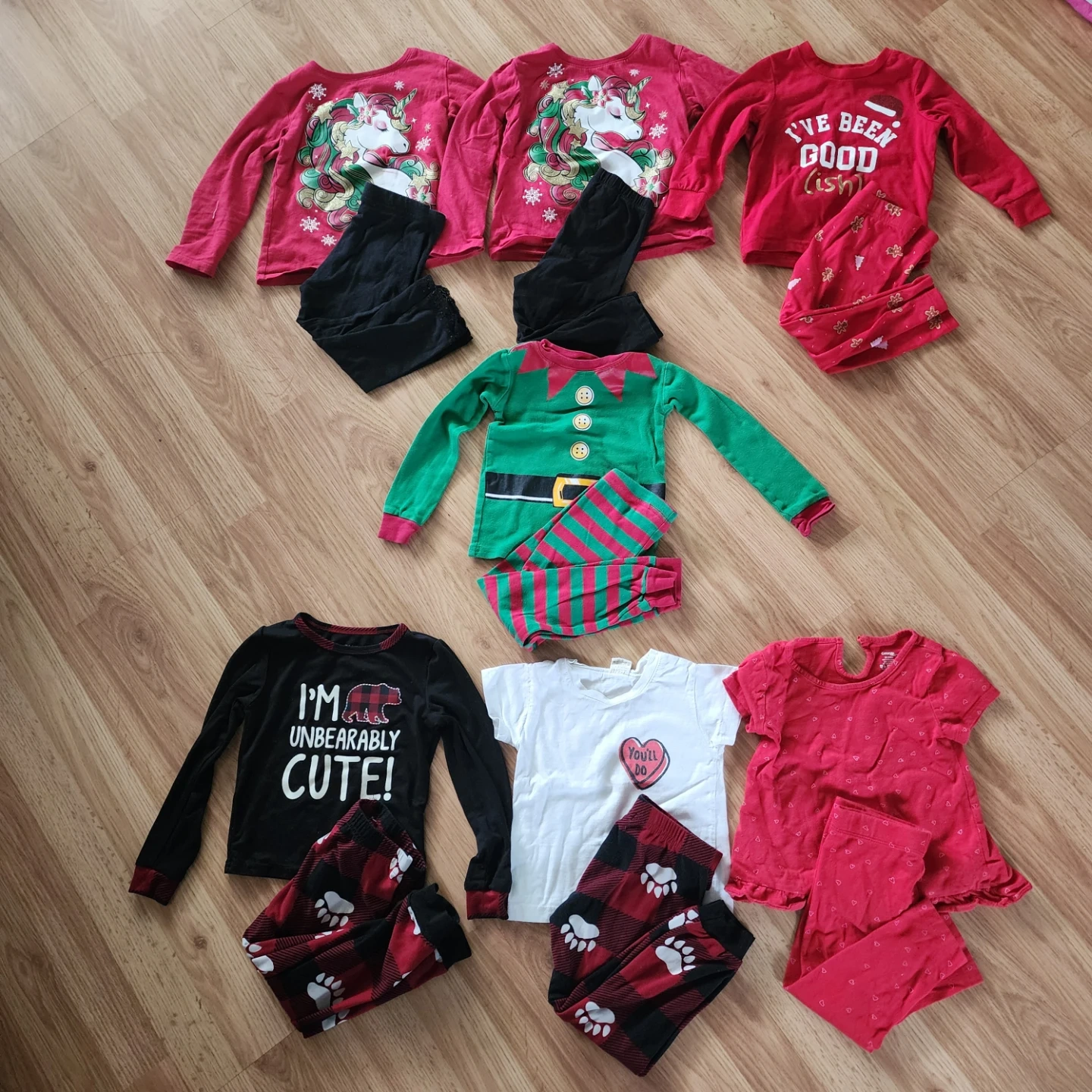 This bundle includes five pairs of girls' holiday-themed pajamas. Mostly long-sleeved tops with matching pants, featuring festive prints like unicorns and plaid. A single elf costume set is also included. All items are sized 18-24 months.