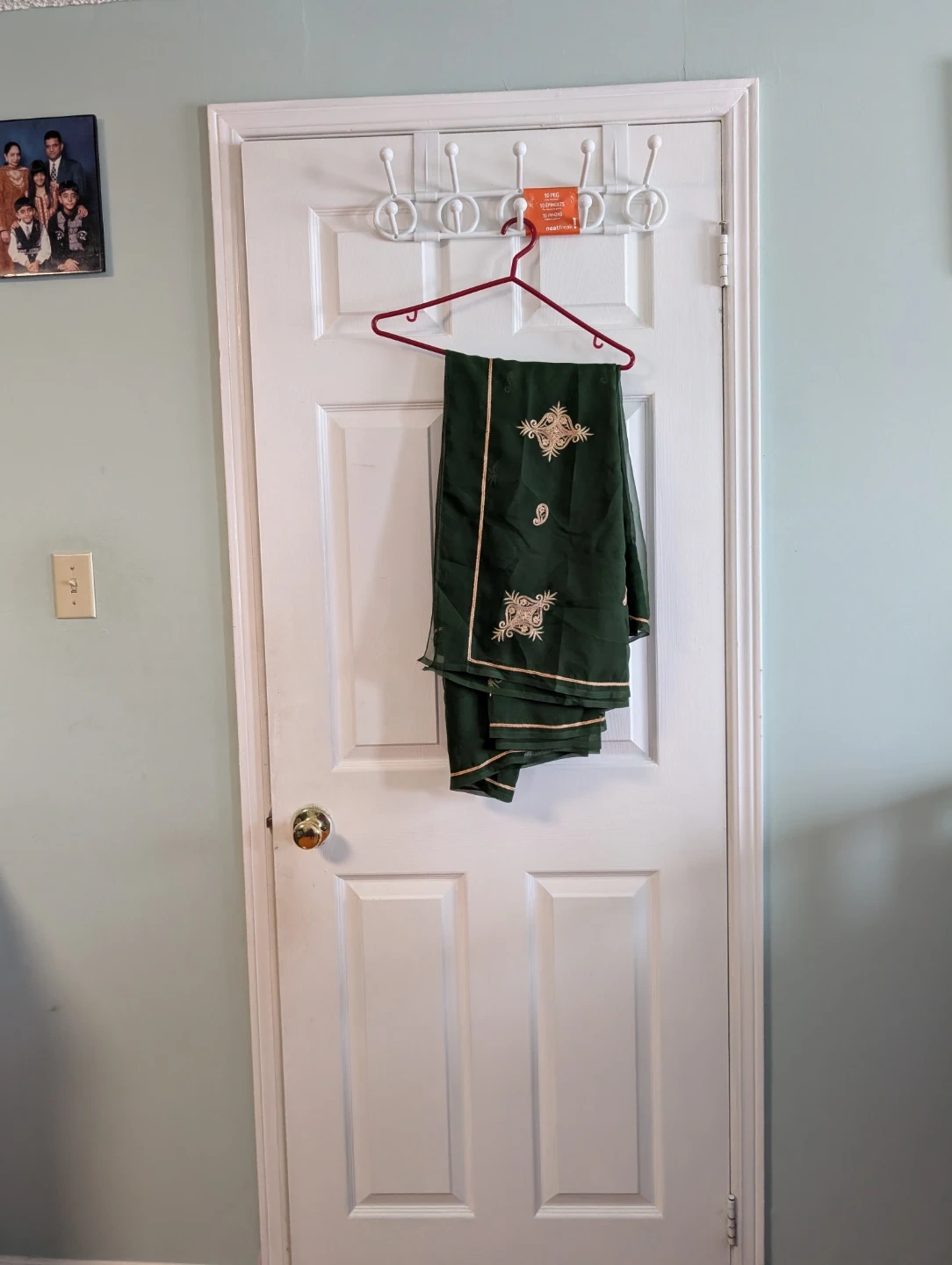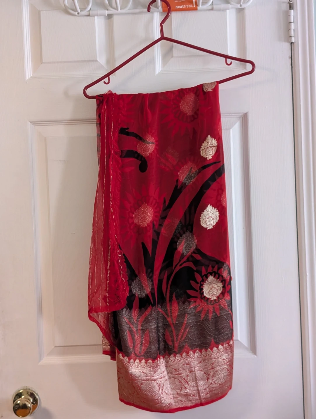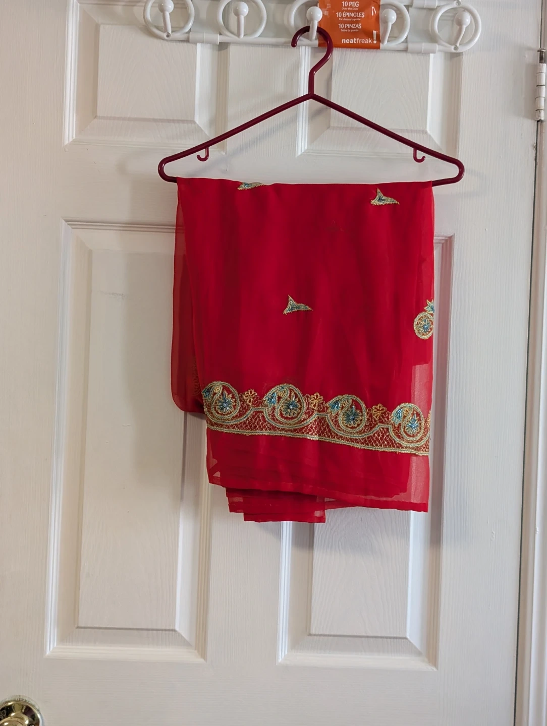 This lot includes four beautiful sarees in various colours: orange, green, red, and pink. They're adorned with intricate embroidery and designs. Great for special occasions!
