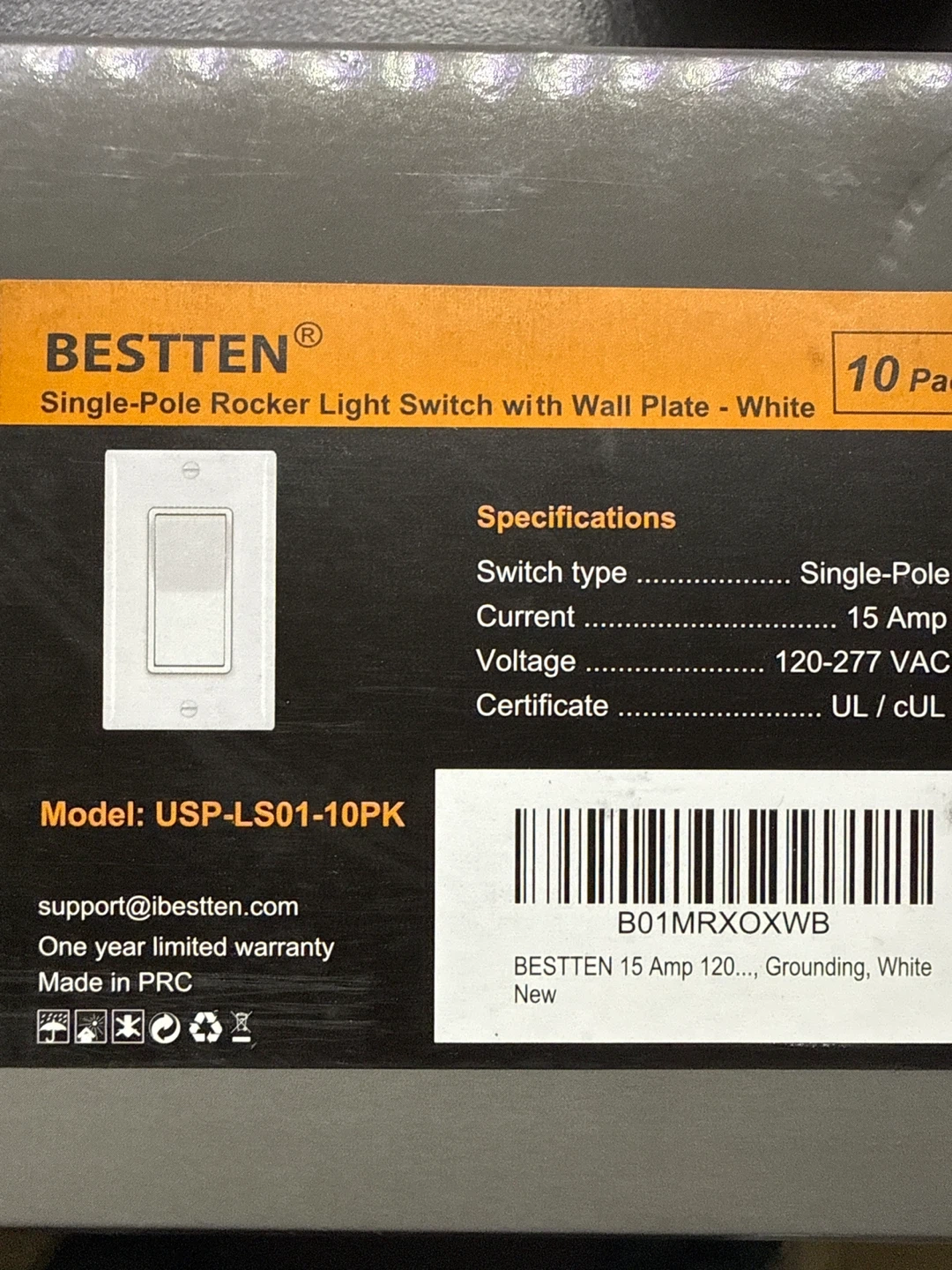 I have 5 brand new (sealed) BESTTEN Single-Pole Rocker Light Switches with wall plates in white. They are rated for 15 Amp and 120-277 VAC. This is a new item.