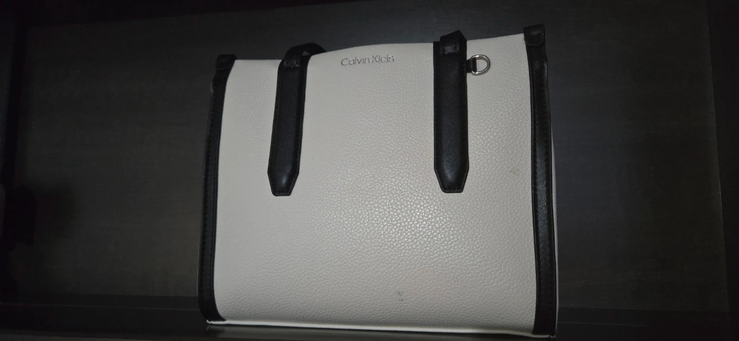 This Calvin Klein purse is white with black trim and handles. It features a zippered main compartment and a structured design. It's a stylish accessory for everyday use.