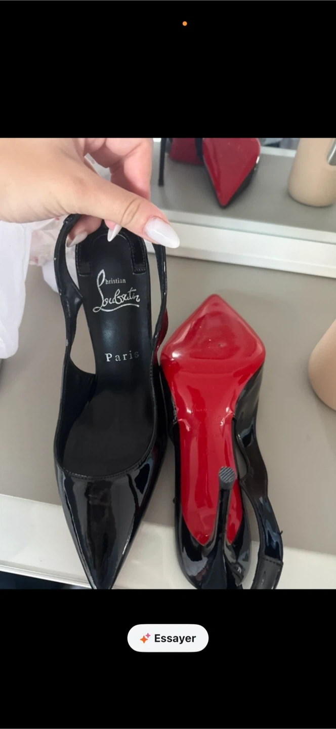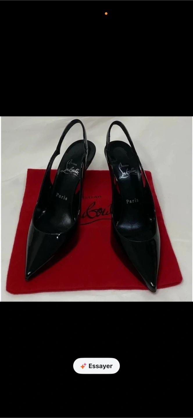 Christian Louboutin black patent leather slingback heels. Classic pointed toe design with the iconic red sole. These heels add a touch of elegance to any outfit.
