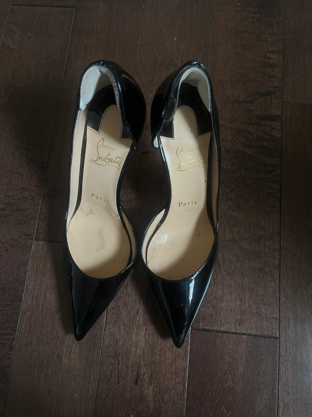 Classic authentic Christian Louboutin heels in black patent leather. Comes with a dust bag and small pouch with extra heel covers. Heel height is approximately 4 inches.