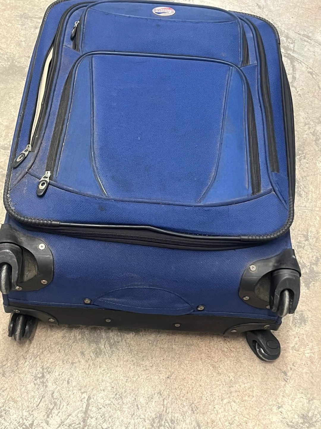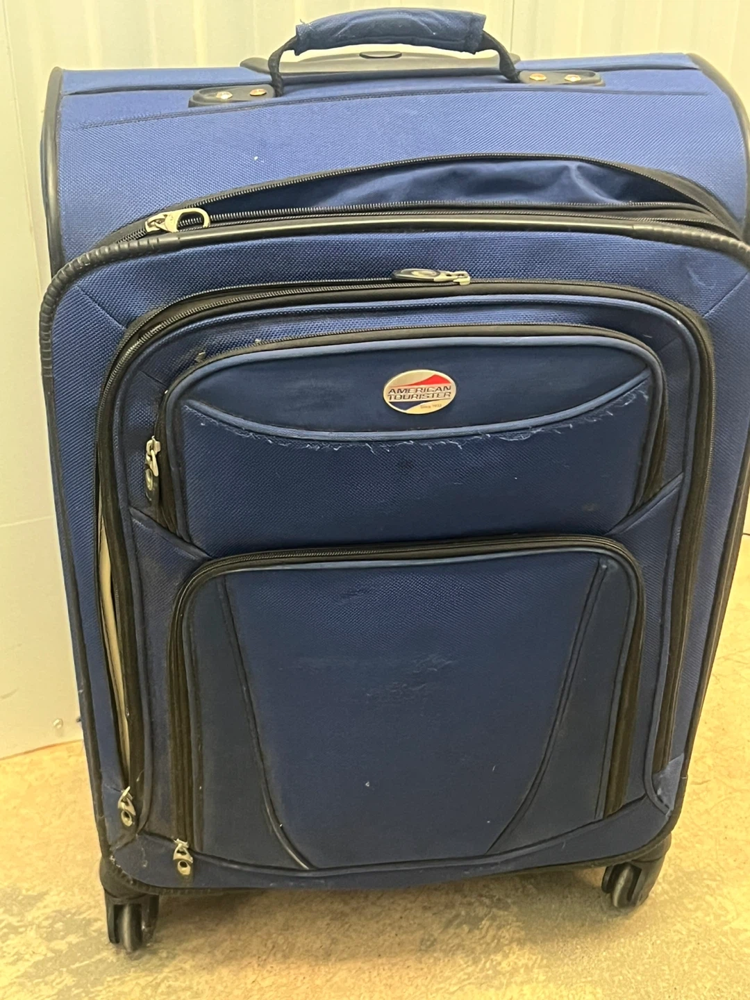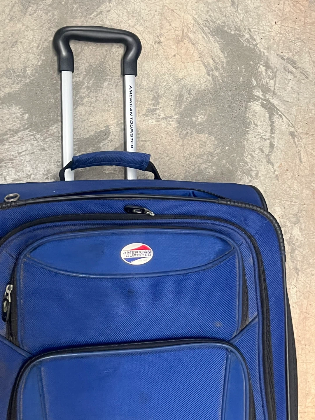 This is a blue American Tourister rolling suitcase. It has multiple zippered compartments and an extendable handle with 4 wheels for easy transport. Perfect for your next trip! 60”x 45”x30”deep