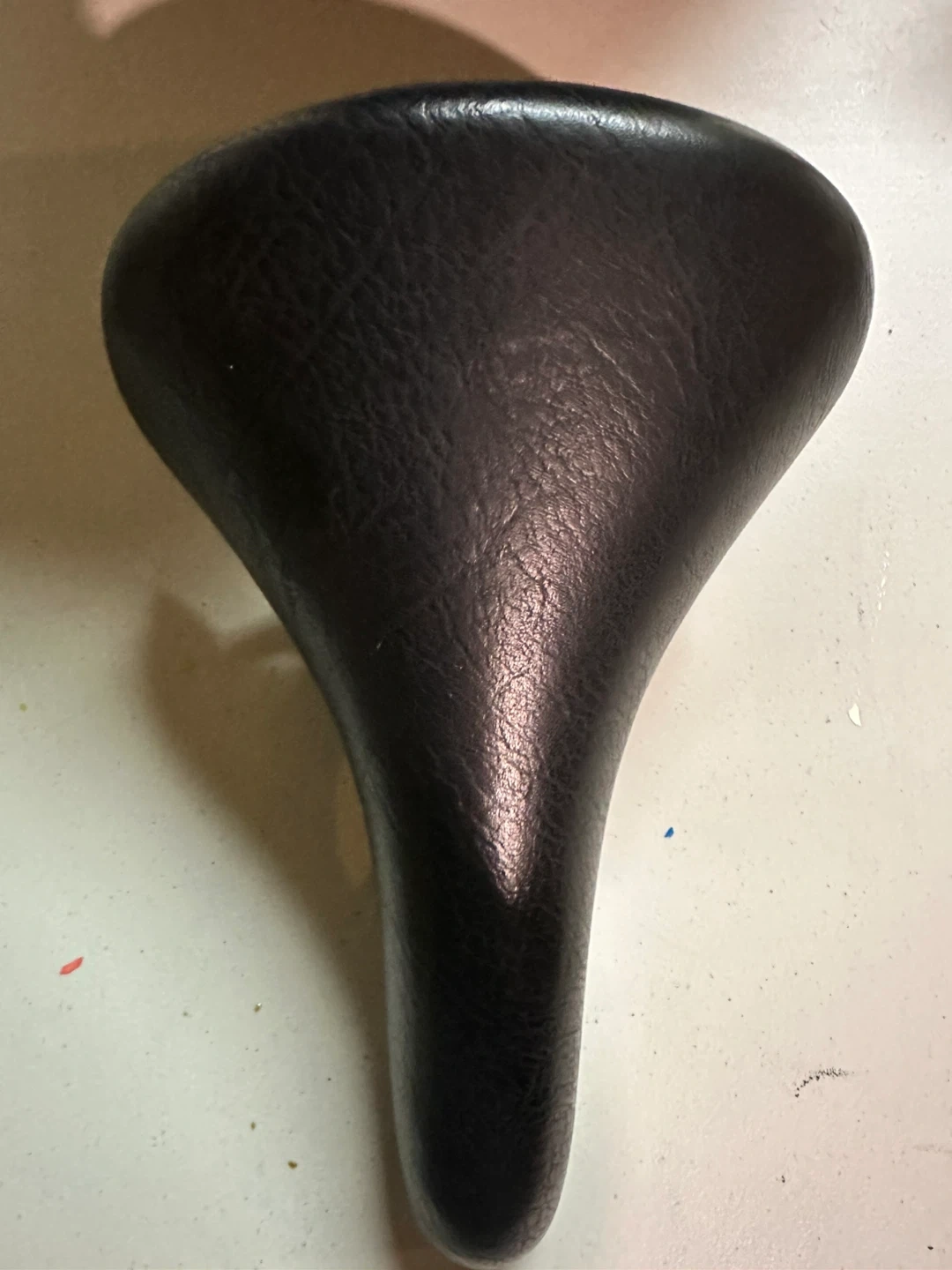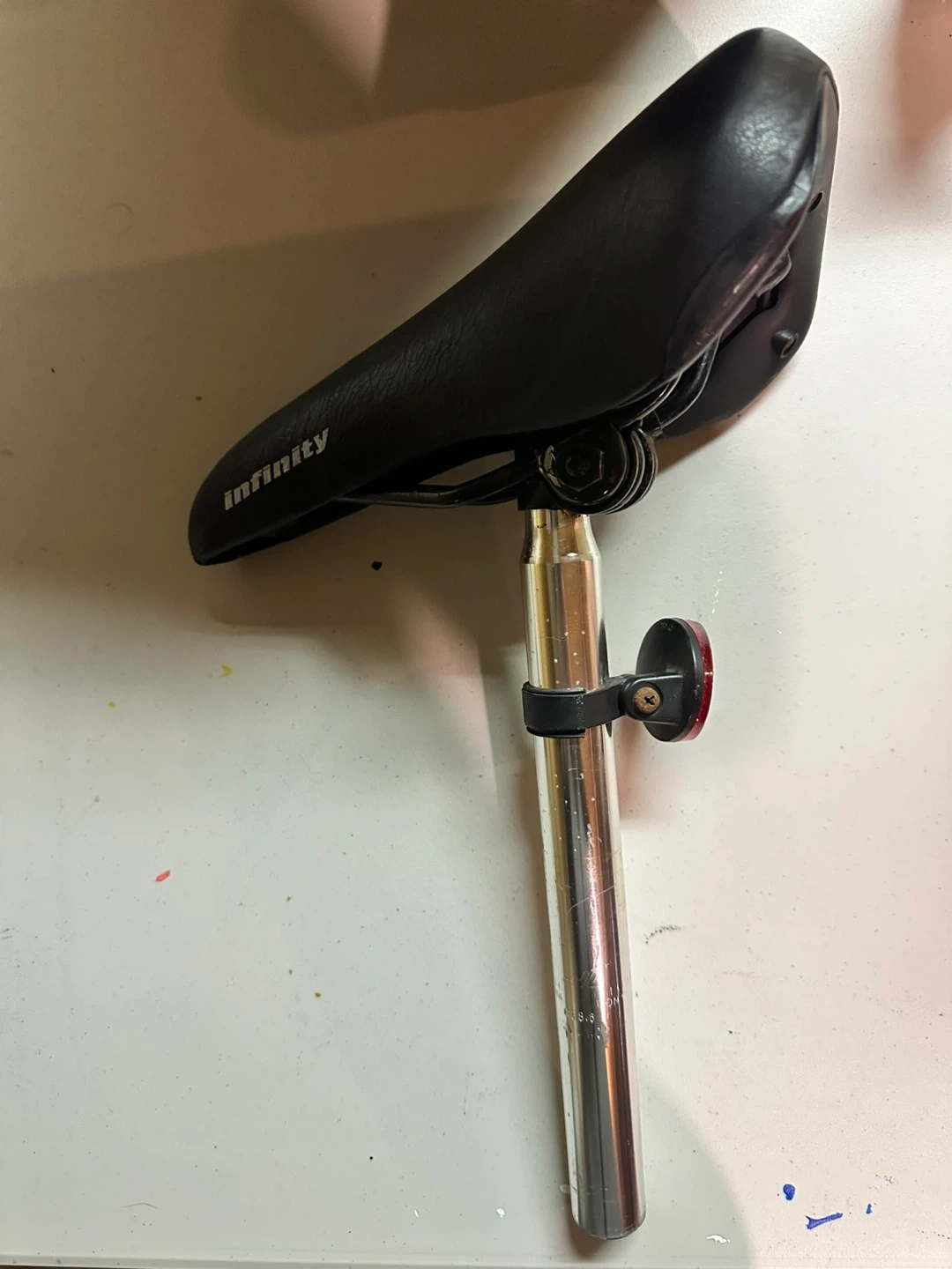 Black Infinity brand bicycle saddle. It's a comfortable saddle with a suspension seat post. The seat post has a diameter of 28.6 mm.