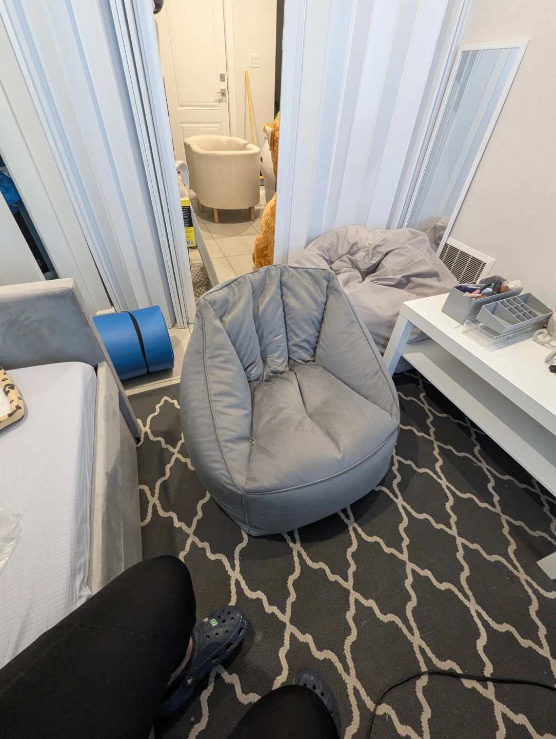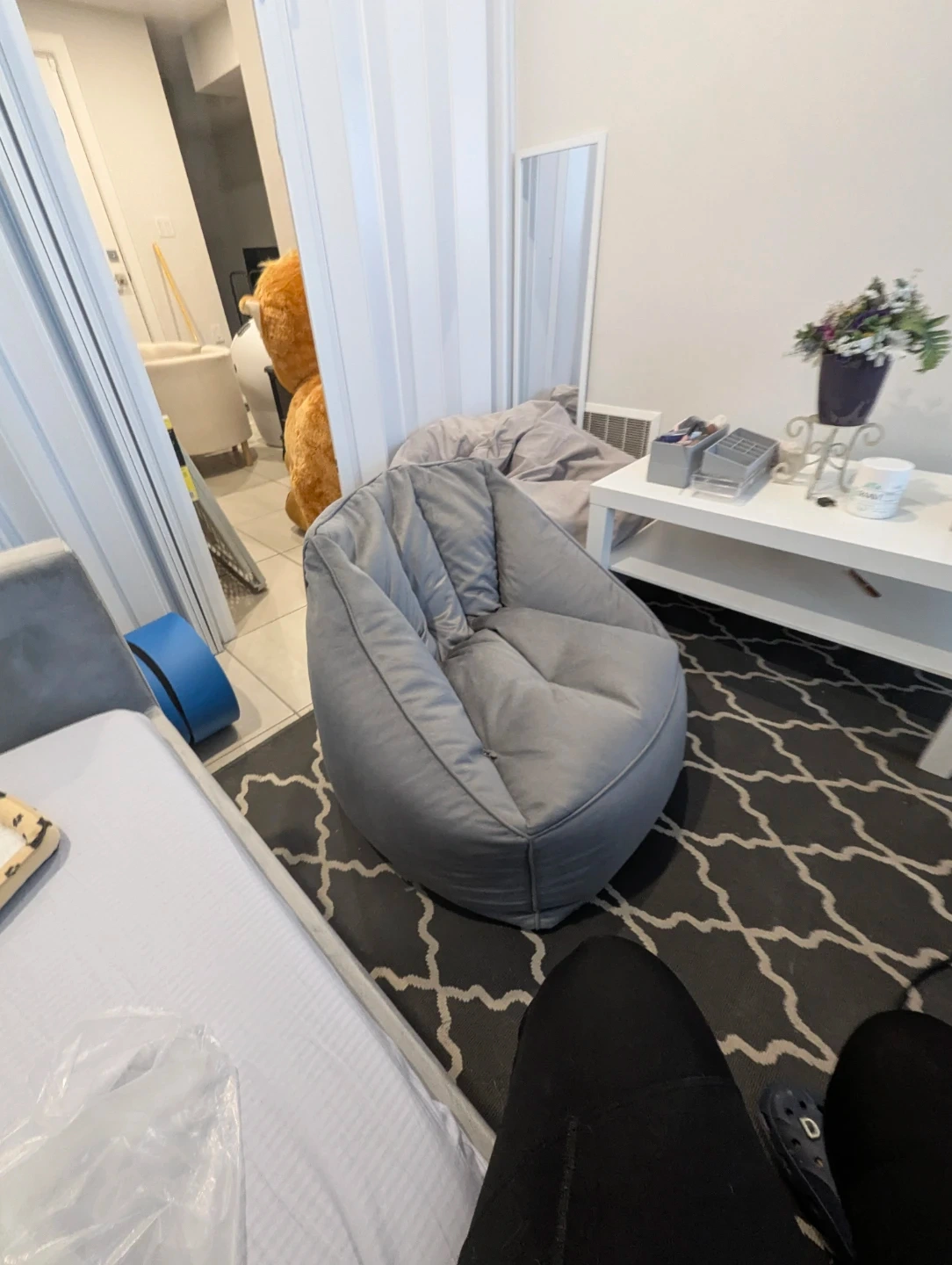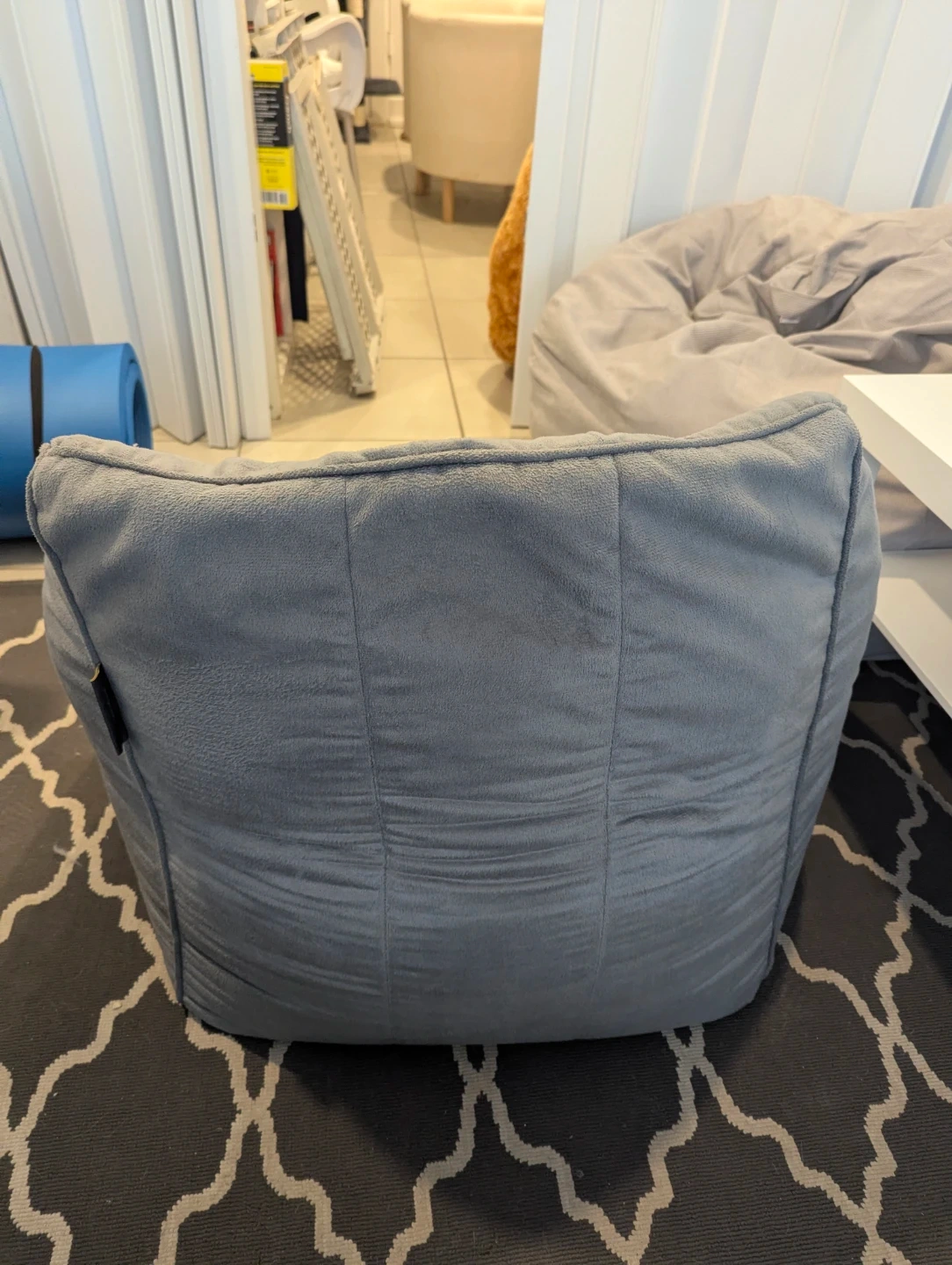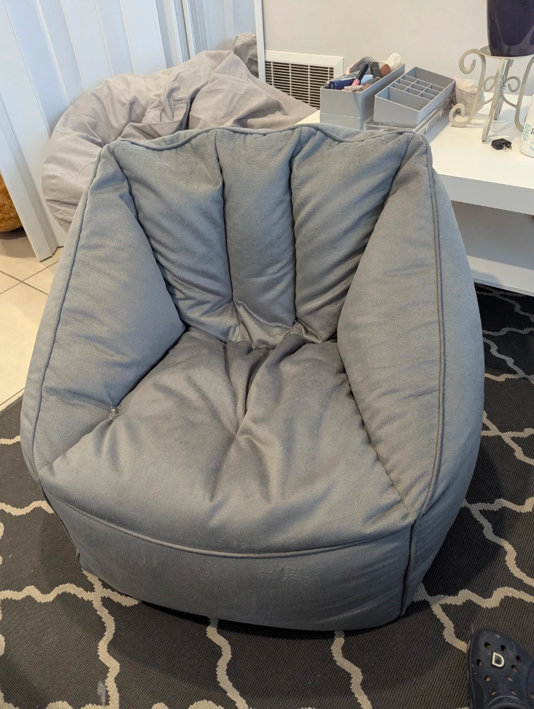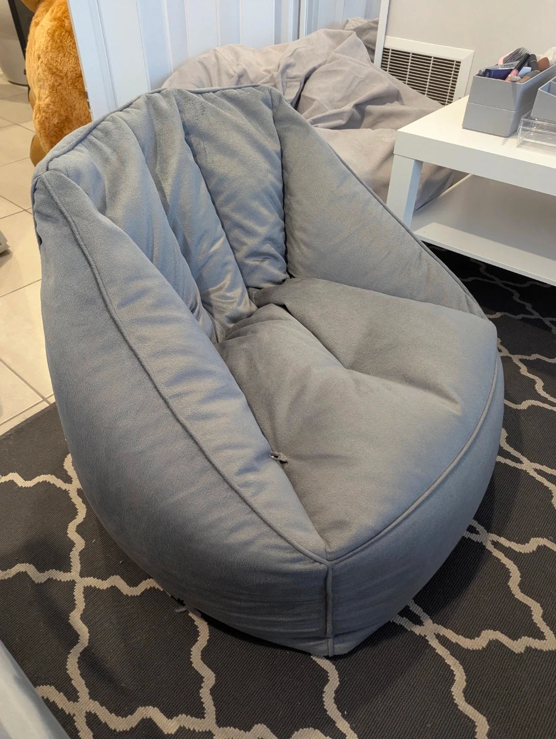 Comfortable grey bean bag chair with a soft, velvety texture. It's great for lounging and gaming. Made with a durable, plush fabric.