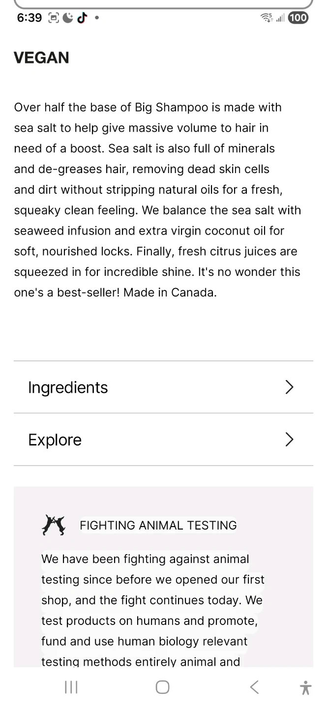 This shampoo is made with sea salt to help give massive volume to hair. Sea salt is full of minerals and de-greases hair, removing dead skin cells and dirt. It balances sea salt with seaweed infusion and extra virgin coconut oil for soft, nourished locks. Fresh citrus juices are squeezed in for incredible shine. Made in Canada.