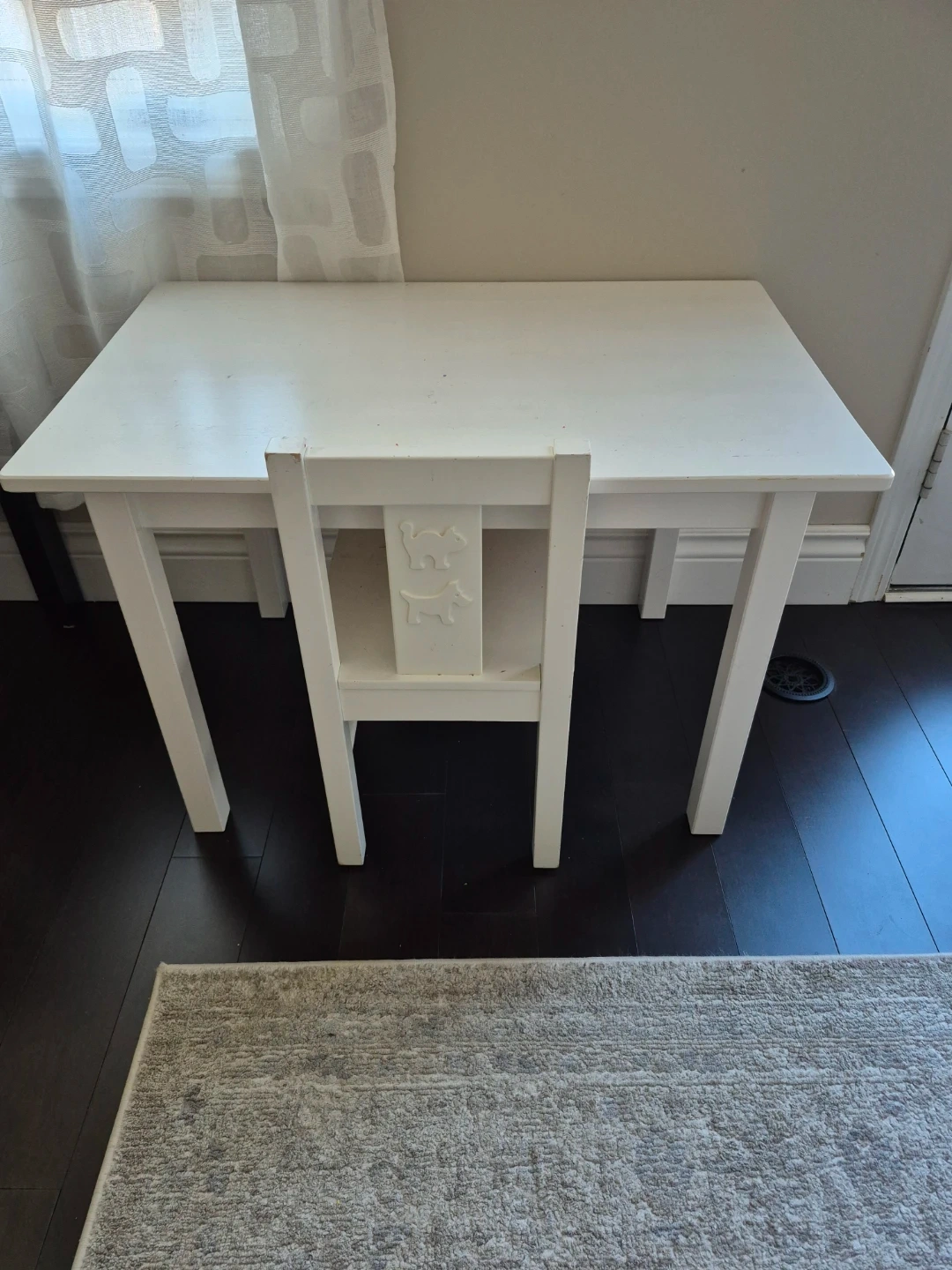 A cute white wooden desk and chair set for children. The chair back has adorable animal cutouts. It's perfect for a child's play area or learning space. Made of wood.