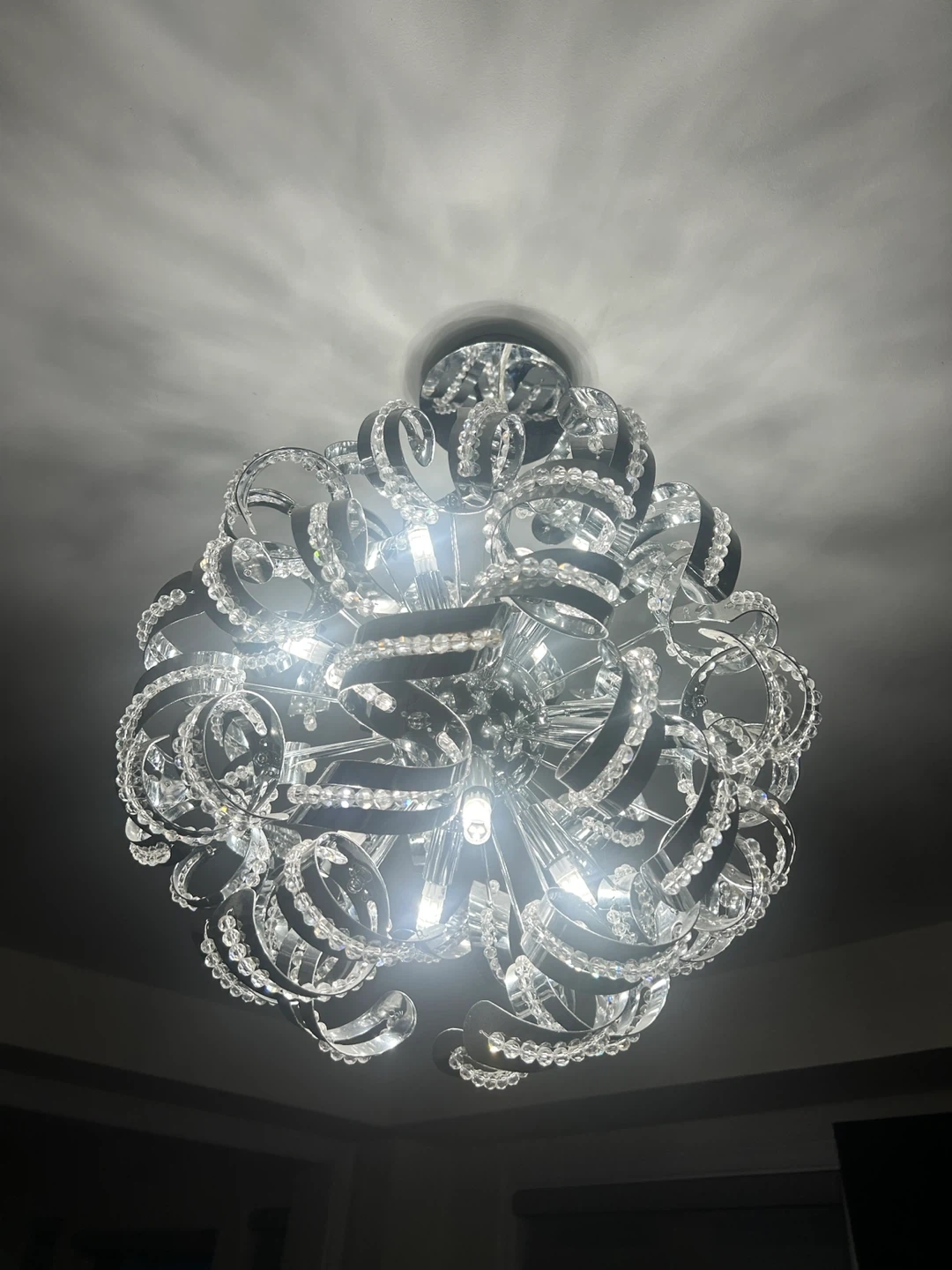 Decorative pendant light fixture with multiple crystal accents and metallic swirls. It's a stylish addition to any room, providing ample illumination. This light is suitable for living rooms or dining areas.
