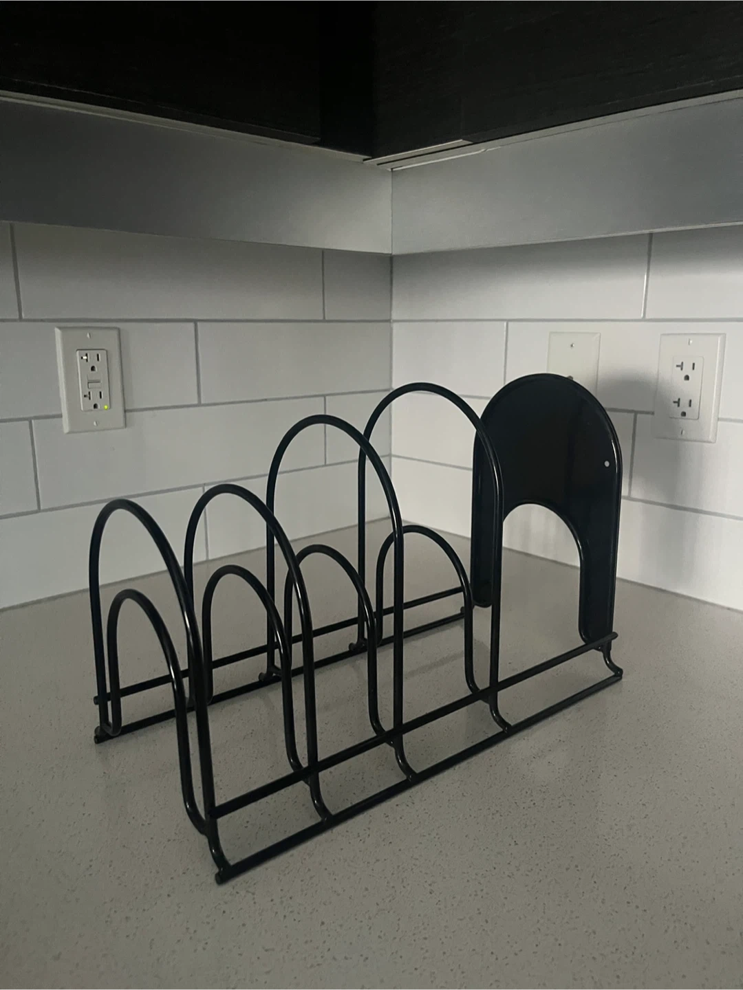 This black metal organizer rack holds multiple pots and pans upright. It's designed to keep your kitchen cabinets tidy and your cookware easily accessible. I used it to hold my Vinyls! Metal construction.