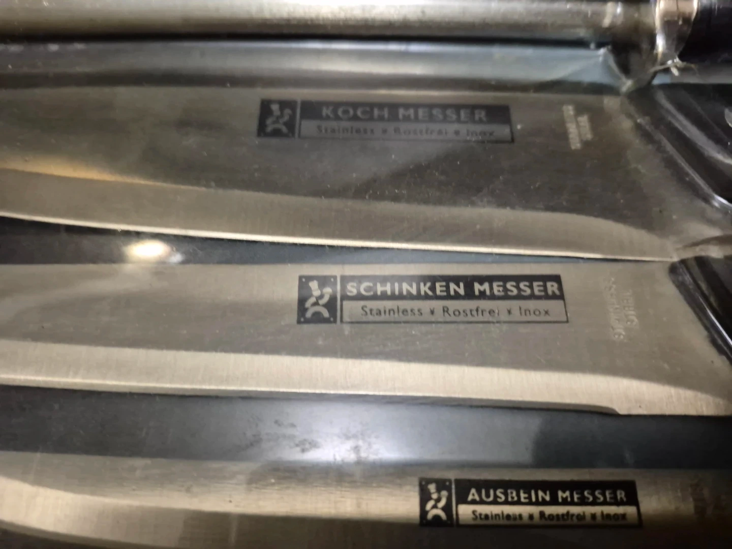 This set includes 5 precision blades with molded grips and a deluxe blade sharpener. All knives are stainless steel construction. It also comes with an 11 1/4" x 7 1/2" cutting board.