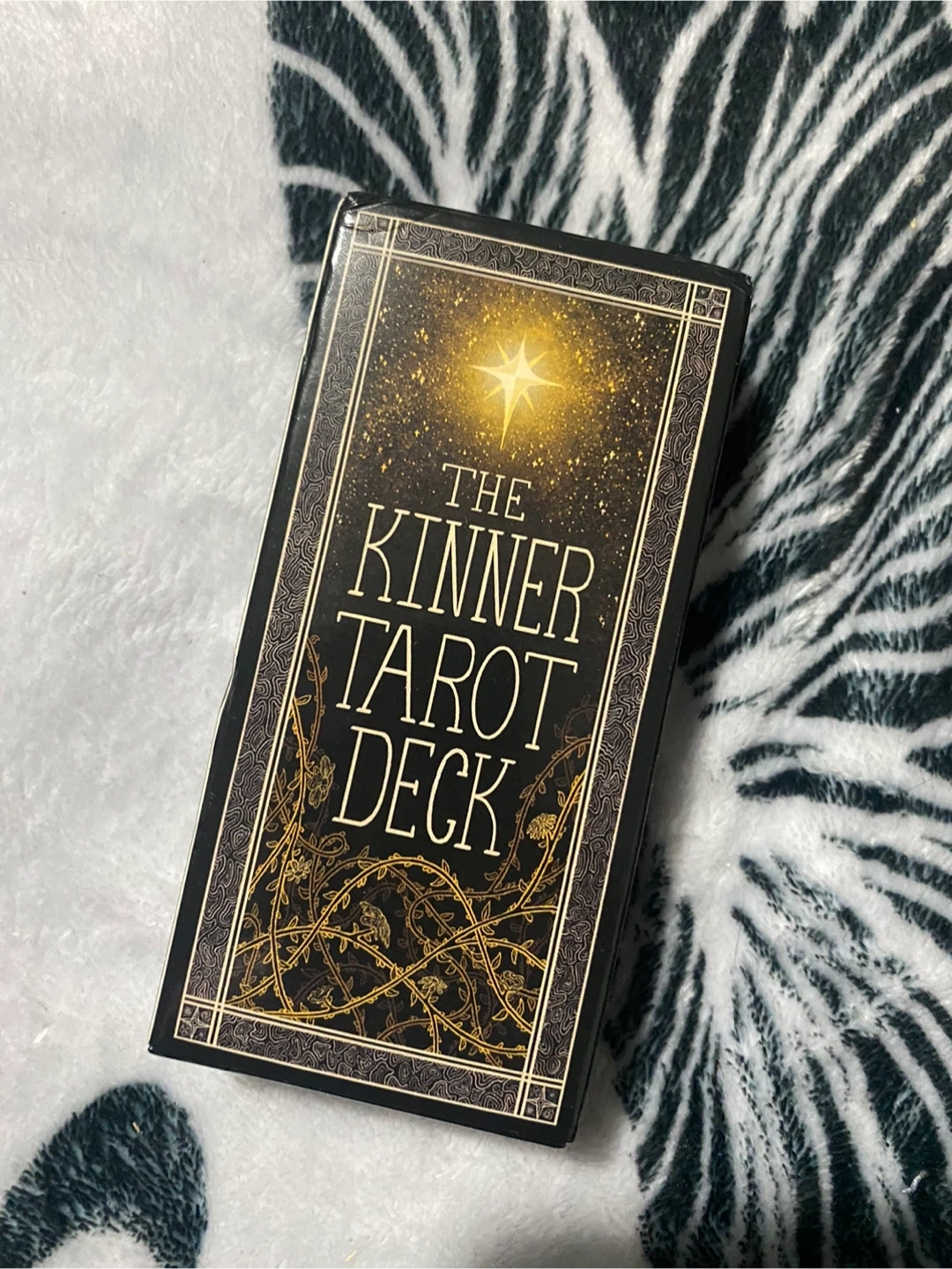 This is The Kinner Tarot Deck, featuring beautiful gold and black illustrations on each card. The deck includes all 78 standard tarot cards. Perfect for divination and self-reflection!
