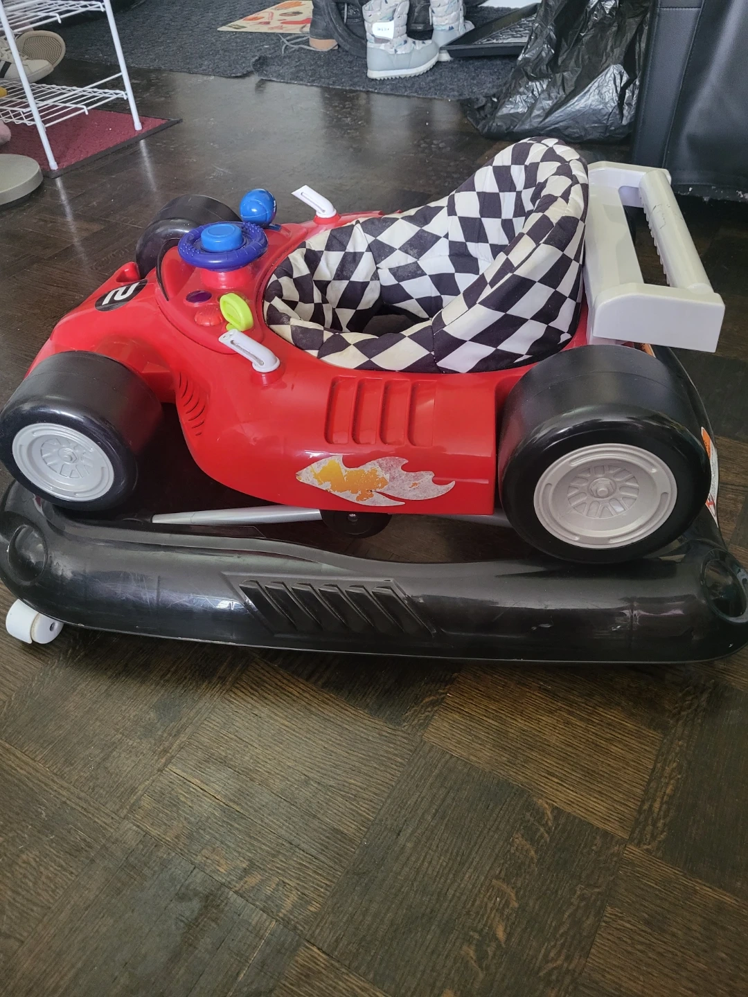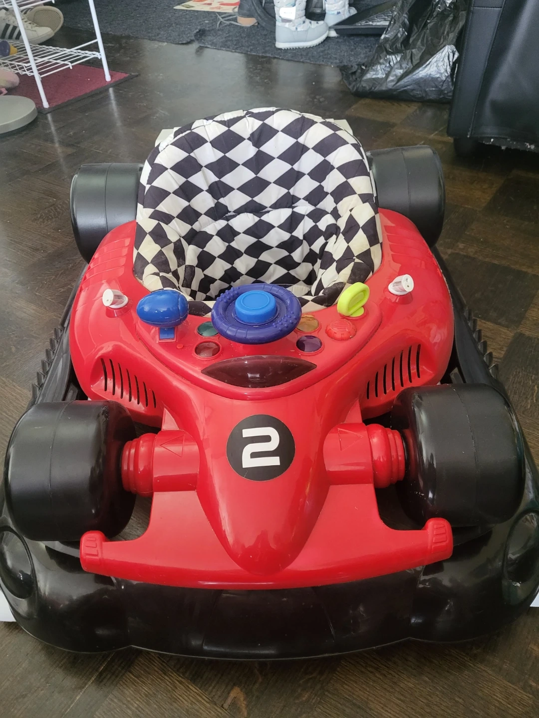 This baby walker is designed like a red race car. It features a checkered fabric seat and interactive toys on the dashboard. It's great for little ones learning to move around!