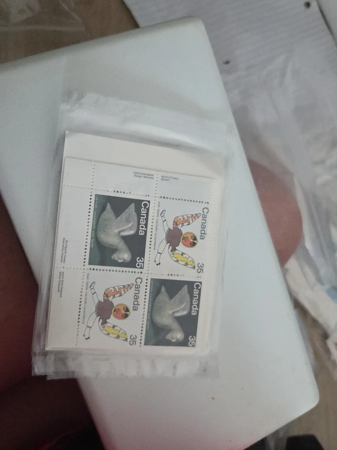 Four Canada 35 cent stamps featuring Inuit spirits and a bird spirit design. Designed by Reinhard and Derreth from notes by Doris Hagiolok and Simon Tookoome. These stamps are in a protective sleeve.