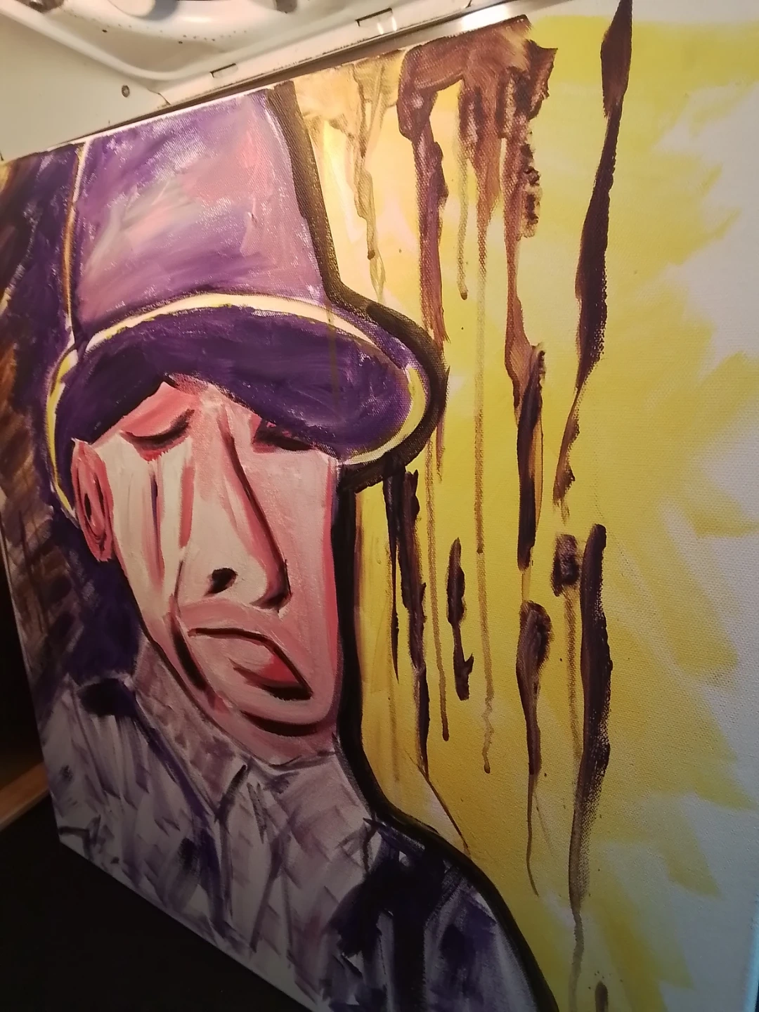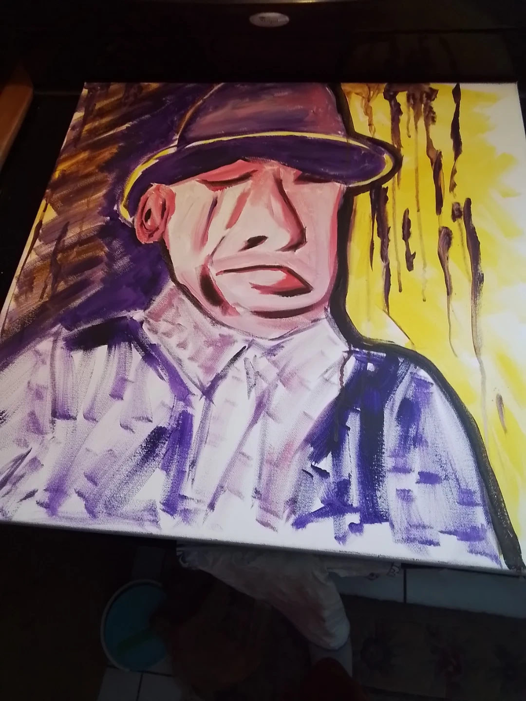 This used painting is a signed original acrylic on board by Niagara artist Cathy Brady. The work measures 24x24 inches and features a unique, expressive style. It's a pre-owned piece with the artist's signature prominently displayed. This piece offers a distinctive touch to any art collection.