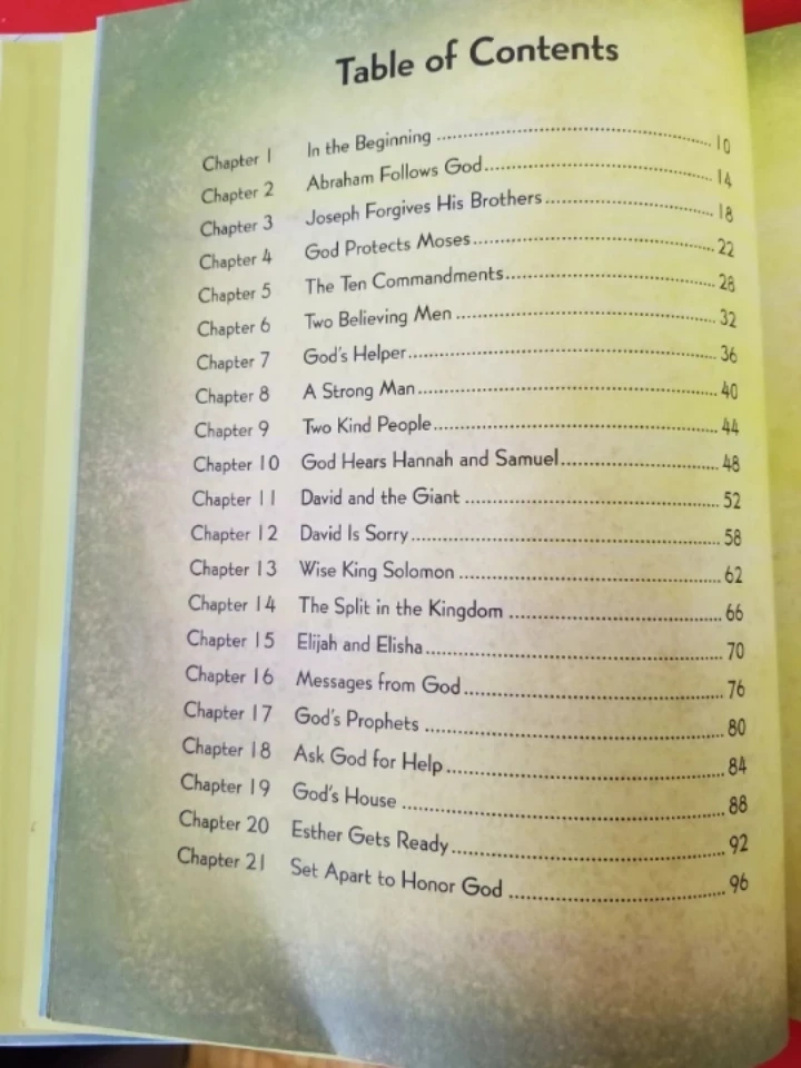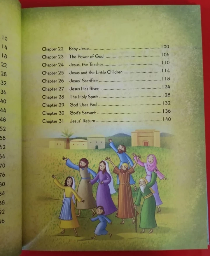 Children's book. Full-color illustrations. Thirty-one Bible stories. Creation, David and Goliath, Birth of Jesus, the Angel at the Tomb. Easy-to-read text. Simple reflection.