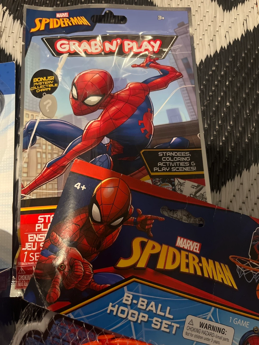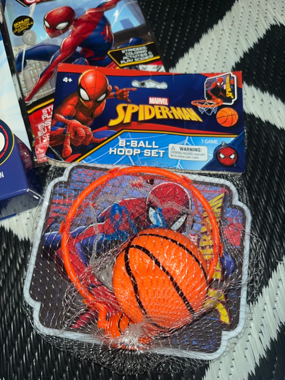 Includes a bath time activity set with 2 bath crayons, 2 bath paints, a stamp, and bath decals. Also features a Spiderman B-Ball Hoop Set with a mini basketball and hoop. Suitable for ages 4+.