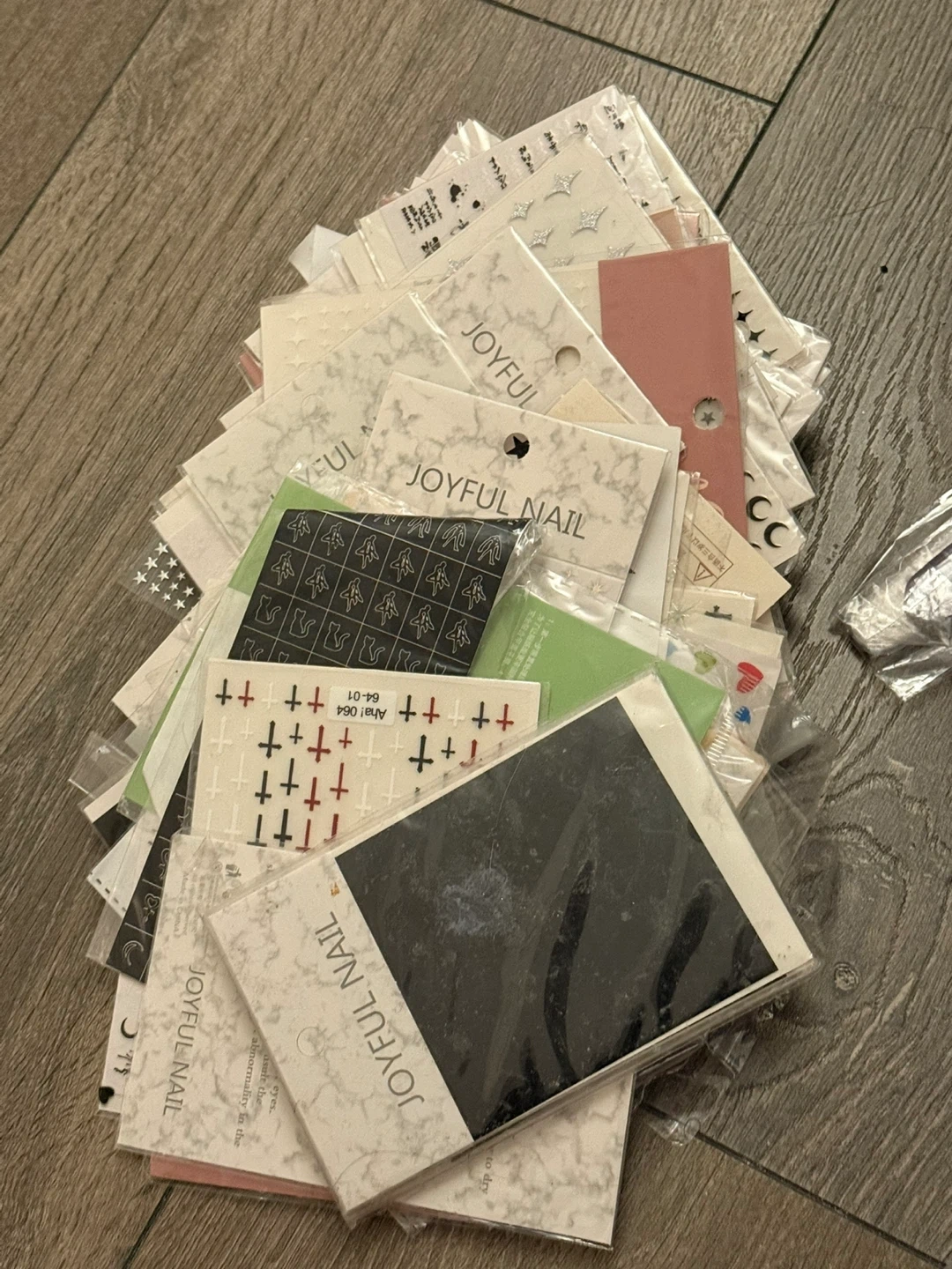 Large collection of nail art decorations including rhinestones, charms, glitter, and foils. Includes various gel polishes and tools like brushes, files, and clippers. Everything you need for professional or home manicures!