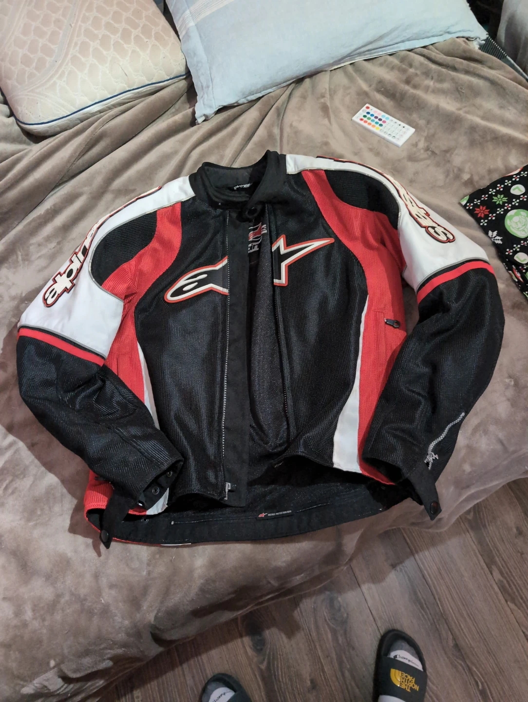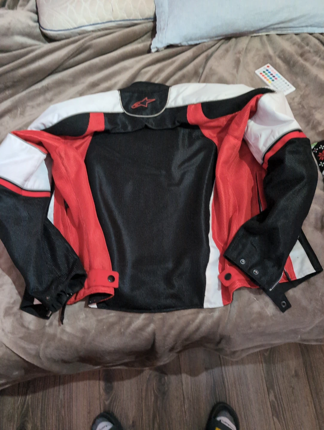 Mesh motorcycle jacket with red, white, and black panels. Features Alpinestars branding on the sleeves and chest. This jacket is designed for airflow and protection while riding. Has backpatting, shoulder, padding and elbow pads built in. Excellent condition. $150 Firm (Size XL)