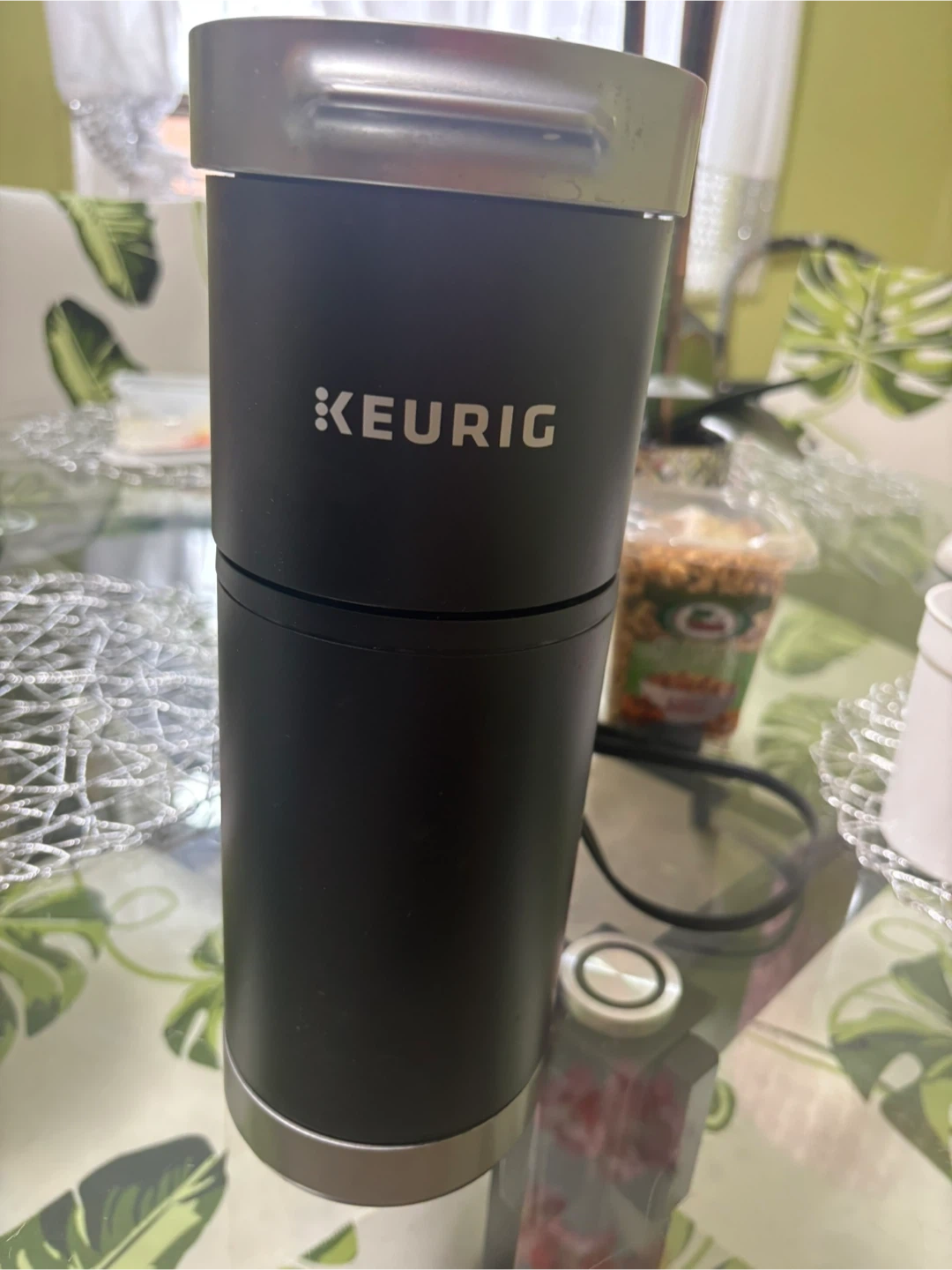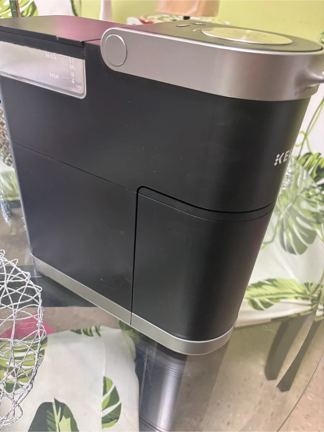 This is a Keurig coffee maker. It's black with silver accents. Features include a water level indicator and k-cup storage.