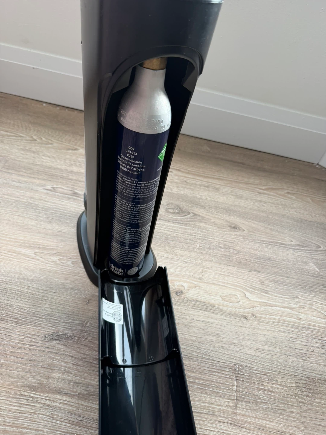 This is a Drinkmate soda maker in black. It lets you carbonate any cold drink, not just water! It requires no electricity and is compatible with standard threaded 60L CO2 cylinders.