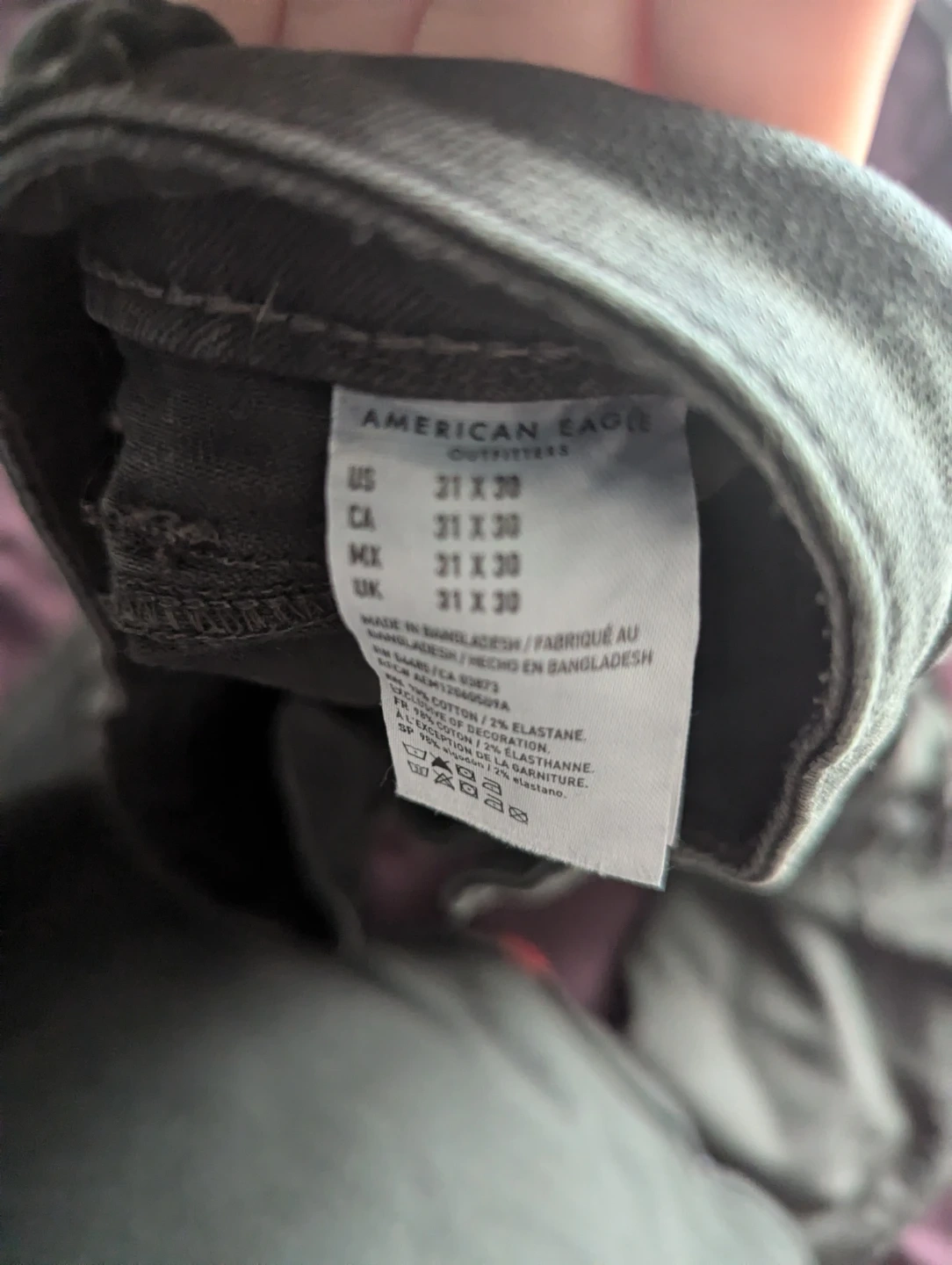 These American Eagle Outfitters jeans are a size 31x30. They're made with a cotton and elastane blend for comfort. These distressed jeans offer a stylish, worn-in look.