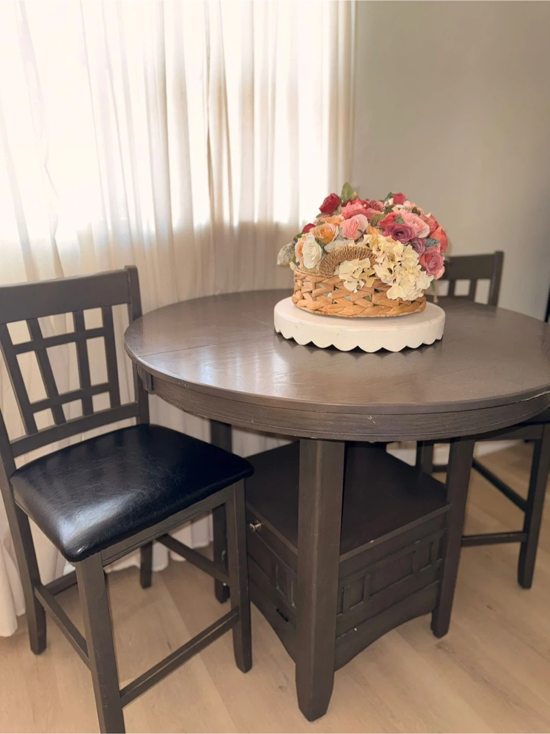 Dark brown round counter height dining table set. Includes two chairs with black upholstered seats. The table has a built-in shelf for storage. Perfect for small spaces!