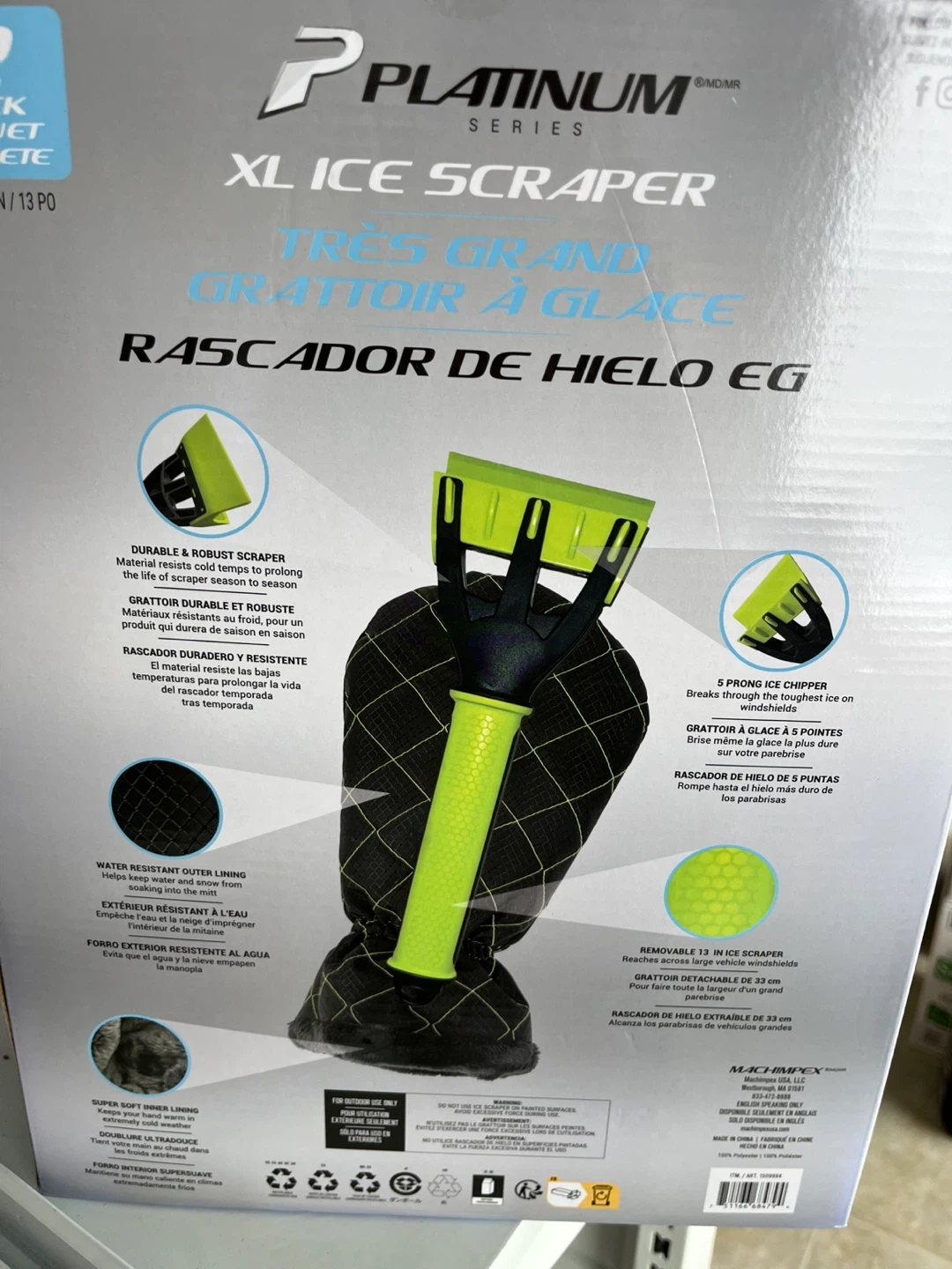 I'm selling a brand new Platinum Series XL Ice Scraper! It features a durable and robust scraper, a 5-prong ice chipper, and a water-resistant outer lining to keep your hands dry. The scraper has a super soft inner lining to keep your hands warm. It also has a removable 13-inch scraper for reaching across large vehicle windshields